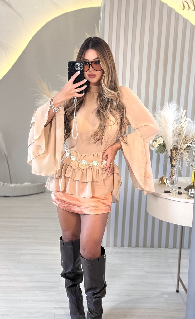 Essa bata é uma peça fluida e sofisticada, com um toque boho-chic. Em um tom bege neutro e elegante, ela se destaca pelas mangas longas com camadas volumosas de babados, que conferem um movimento delicado e romântico ao look.