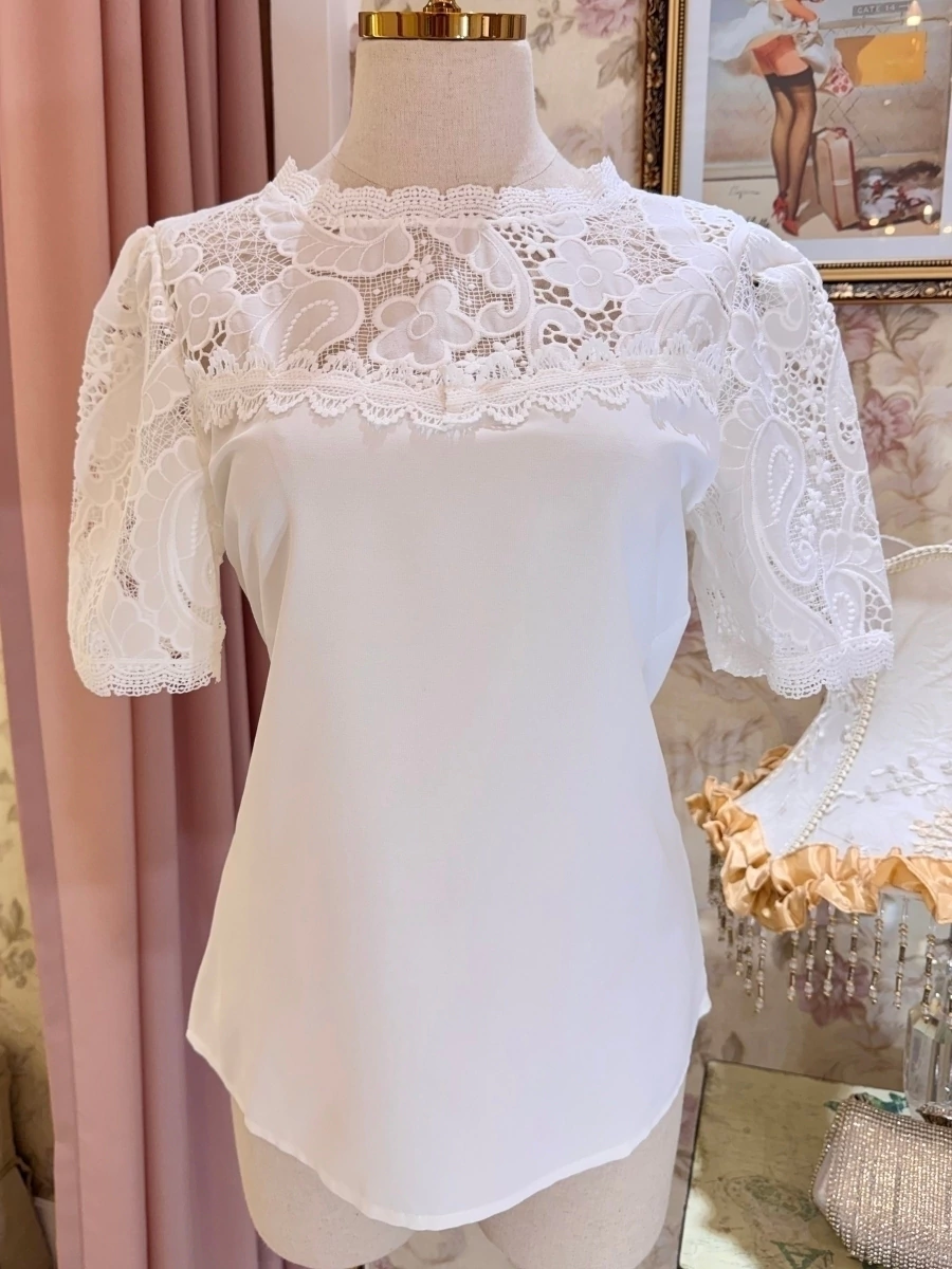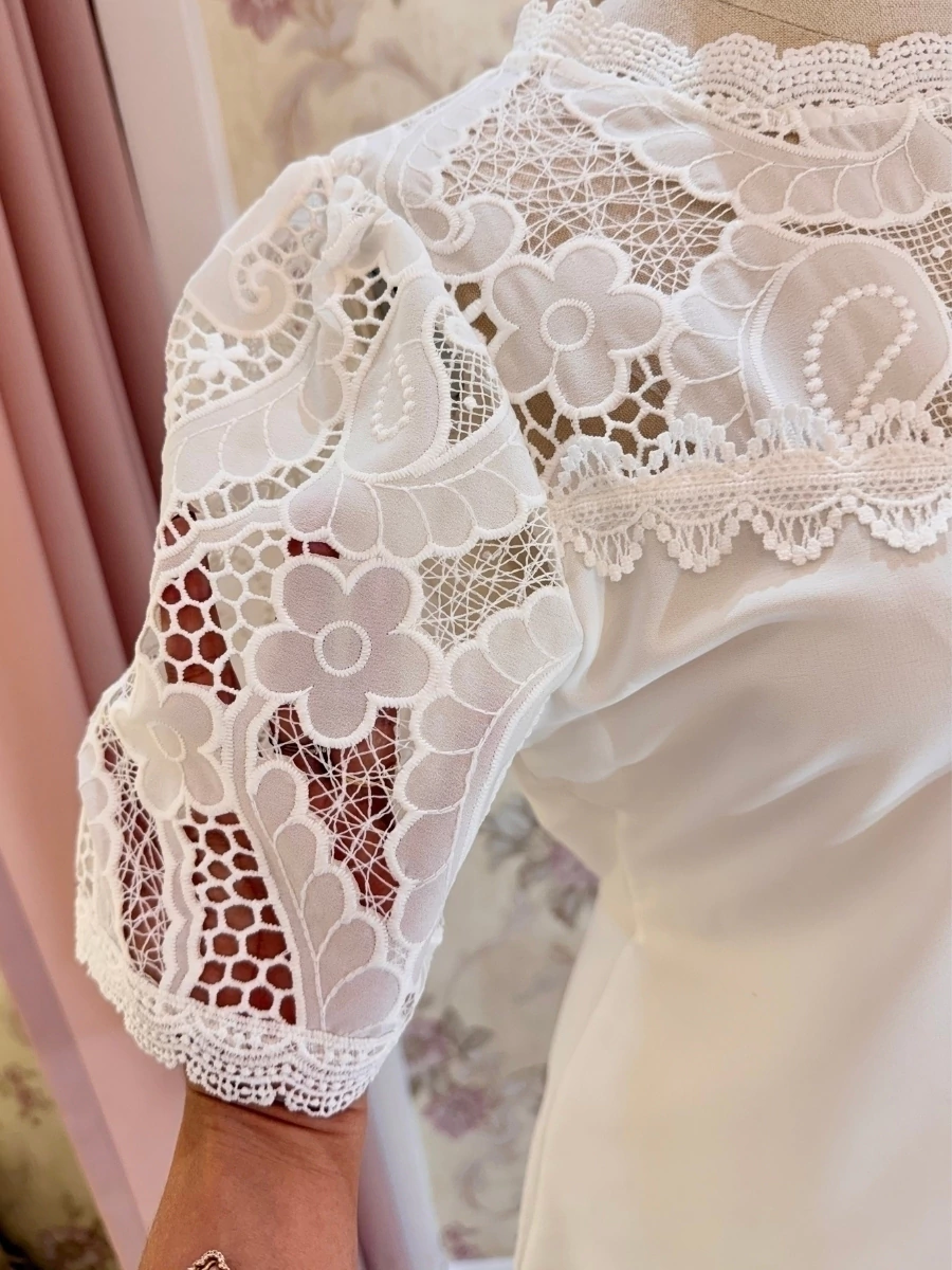 O charme está nos detalhes em renda no colo e nas mangas, que conferem um toque romântico e refinado à peça, tornando-a perfeita para composições elegantes e femininas.