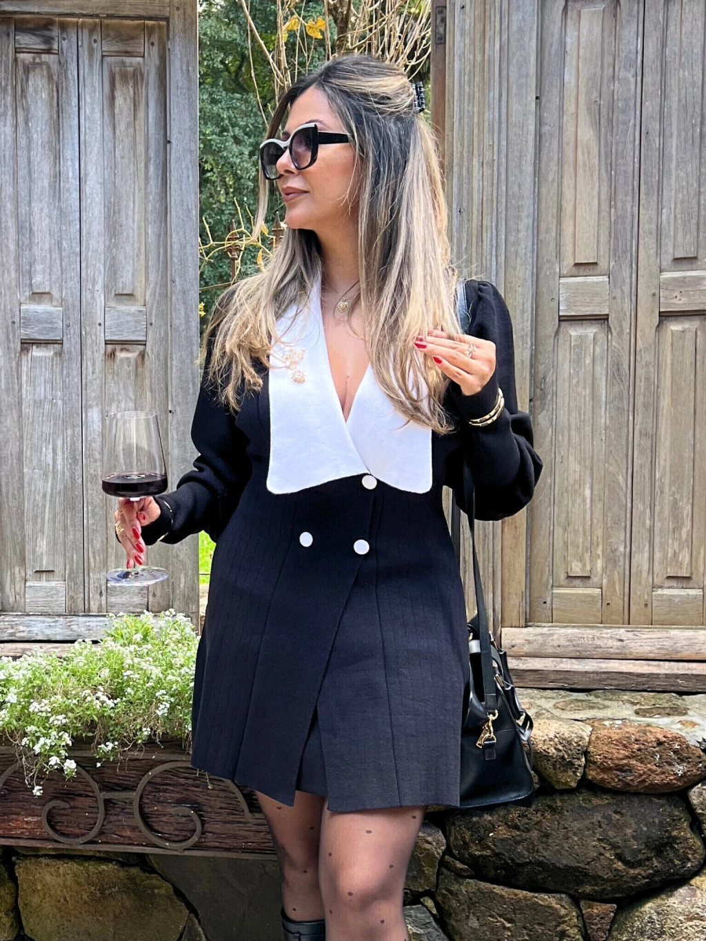 Este conjunto combina um casaco elegante com uma saia que harmoniza perfeitamente com a parte de cima. O casaco tem um corte sofisticado, com fechamento frontal por botões duplos e uma gola ampla em tom contrastante, que traz um toque clássico ao visual. As mangas longas e os detalhes nos punhos valorizam ainda mais a peça. A saia tem um caimento fluido e discreto, mantendo o conjunto alinhado e refinado. É um look ideal para ocasiões especiais, eventos sociais ou encontros onde estilo e elegância são essenciais.