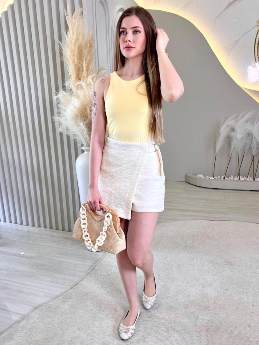 Seu tom vibrante de amarelo traz luminosidade e sofisticação, tornando o body a escolha perfeita para composições que pedem estilo e presença. Versátil, pode ser usado tanto em looks casuais quanto em produções mais elaboradas, sempre com um toque de confiança e feminilidade.