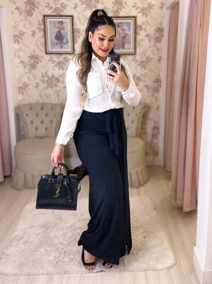 Com um design que harmoniza tradição e modernidade, esta calça longa preta destaca-se pela cintura ajustada e um laço frontal que proporciona um toque de sofisticação refinada. O recorte frontal diferenciado confere personalidade à peça, valorizando a silhueta com um caimento impecável e confortável. Versátil, é a escolha ideal para eventos formais ou para compor um look clássico e profissional no ambiente de trabalho. Uma peça essencial para transformar qualquer ocasião em um momento de prestígio e estilo atemporal.