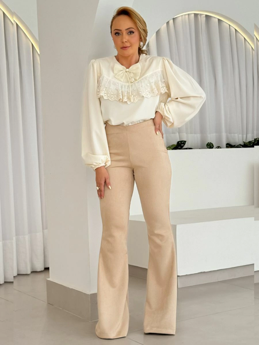 Calça flare confeccionada em tecido encorpado e macio, que valoriza a silhueta ao proporcionar conforto durante o uso. Apresenta modelagem ajustada até o joelho, com abertura elegante na barra, resultando em um caimento alongado e sofisticado. A cintura alta oferece sustentação eficiente, definindo a linha da cintura para um visual alinhado e harmonioso. Versátil, esta peça transita com facilidade entre composições casuais e produções mais elaboradas.