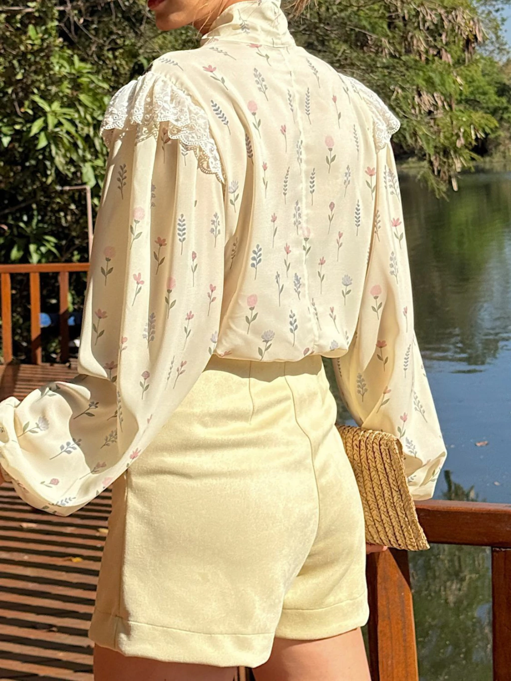 Com estampa floral em tons suaves e fundo claro, a Camisa Julia traz frescor e elegância ao visual. O laço na gola adiciona um toque clássico e feminino, enquanto as mangas longas com leve franzido nos punhos e aplicação de renda de algodão nos ombros reforçam o cuidado nos acabamentos.