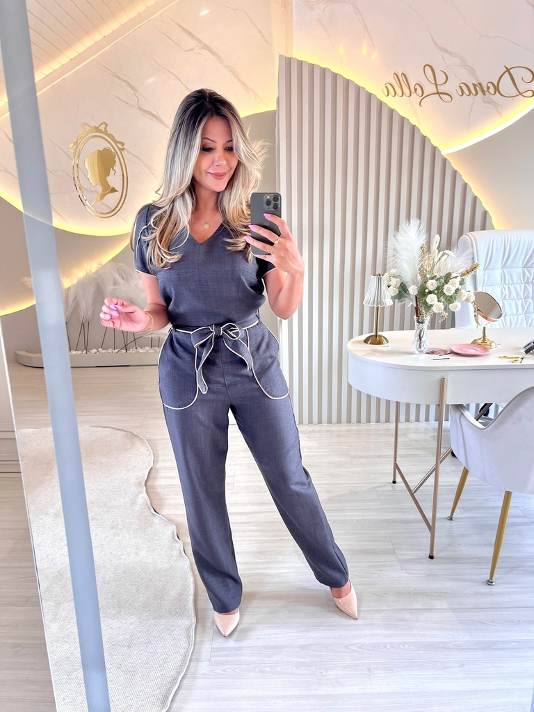 Este conjunto transmite sofisticação e conforto em uma proposta elegante e contemporânea. A blusa possui um corte fluido, com mangas levemente estruturadas e discretas, proporcionando um caimento harmonioso.