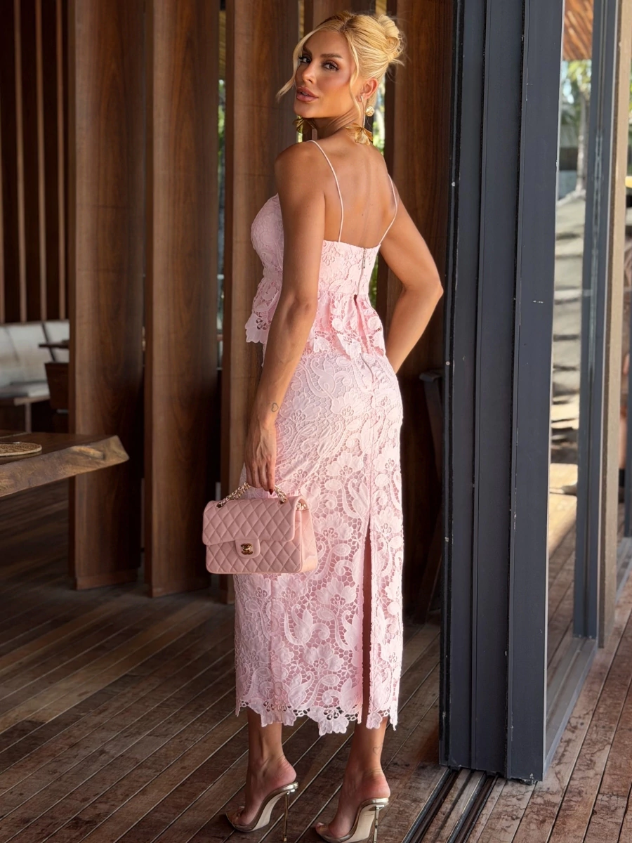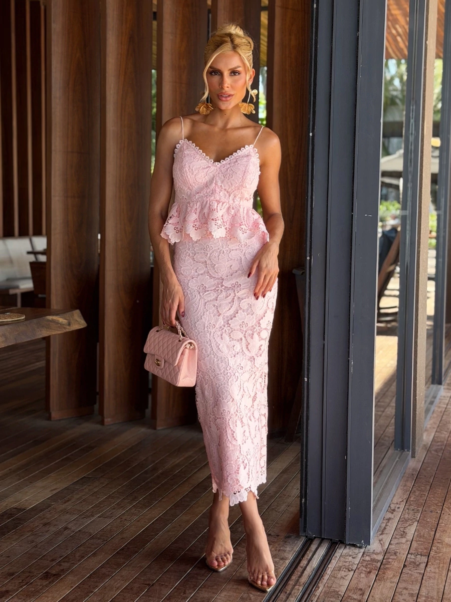 Com seu cropped de alcinhas finas e decote em V combinado à saia midi reta de renda floral, o modelo equilibra romantismo e sofisticação, ideal para ocasiões especiais de verão.