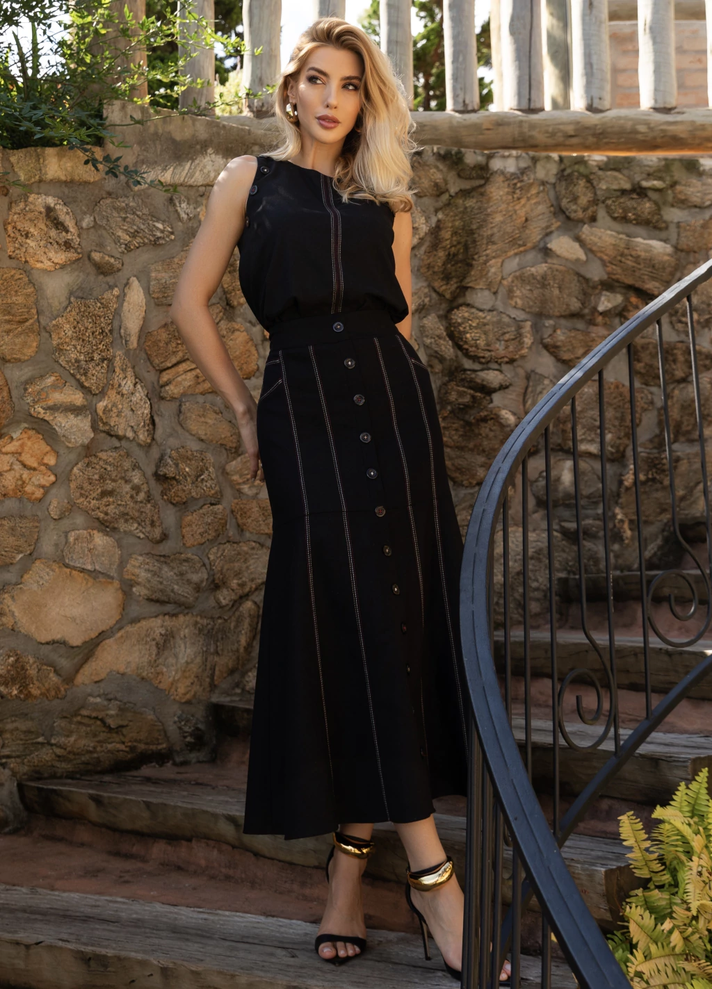 Elegante e prático, esse vestido longo é perfeito para compor looks versáteis com um toque de estilo. Confeccionado em tecido leve e encorpado, possui design bicolor com listras contrastantes na saia e no contorno do decote. Ideal para combinar com botas ou sandálias, em produções casuais ou mais arrumadas.