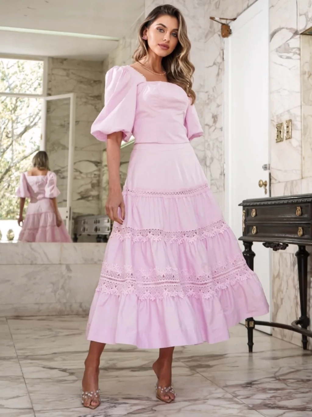A saia apresenta caimento fluido com camadas de babados, criando leveza e movimento a cada passo.