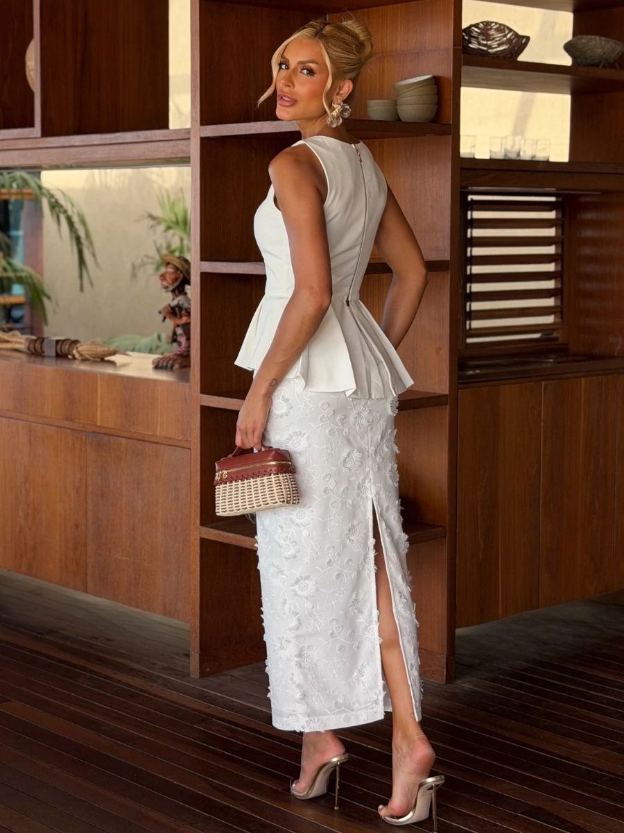Modelagem: Top estruturado com barra peplum + Saia midi bordada
