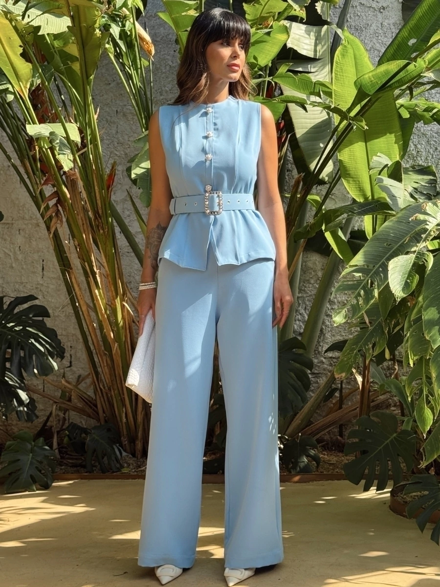 Conjunto composto por blusa estruturada e calça de alfaiataria.