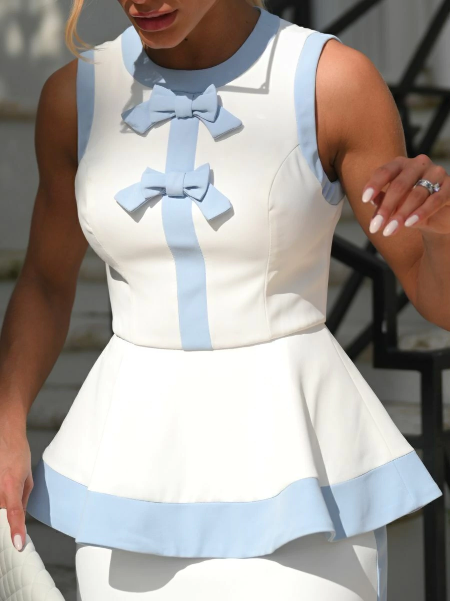 O top estruturado apresenta recorte peplum que valoriza a silhueta e laços aplicados que adicionam feminilidade e um ar ladylike com toque divertido. A saia mini, em corte clássico e moderno, equilibra o visual com uma proposta fresca e atual.