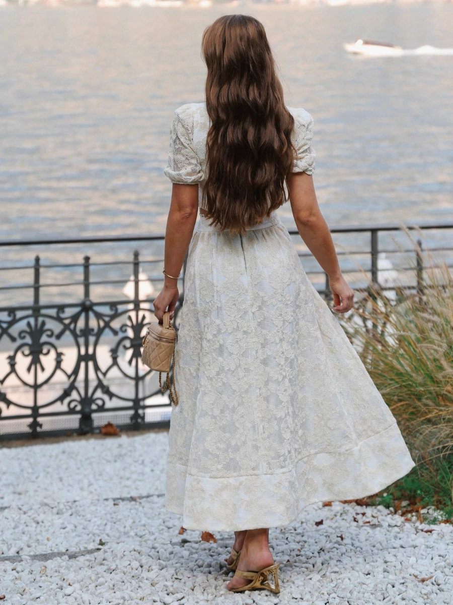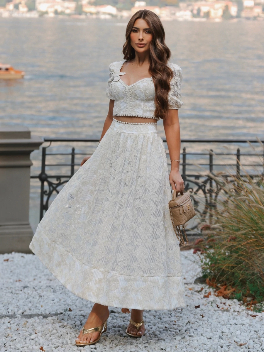 Composto por top estruturado com mangas bufantes e saia midi rodada, o modelo traduz feminilidade em cada detalhe — perfeito para eventos especiais, jantares e celebrações.