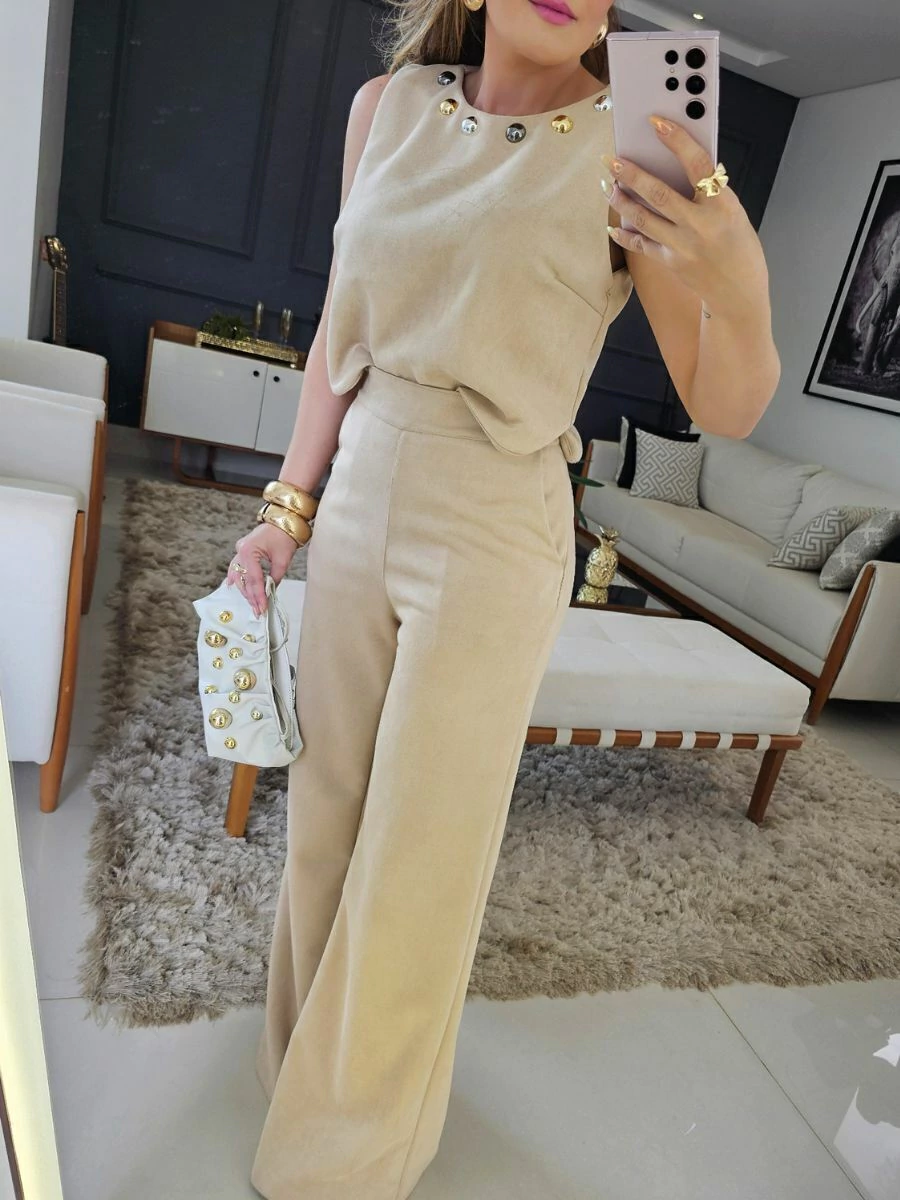 Elegância e atitude em um só look! Conjunto Tais nude com pantalona fluida e aplicação de spikes para um toque de estilo.