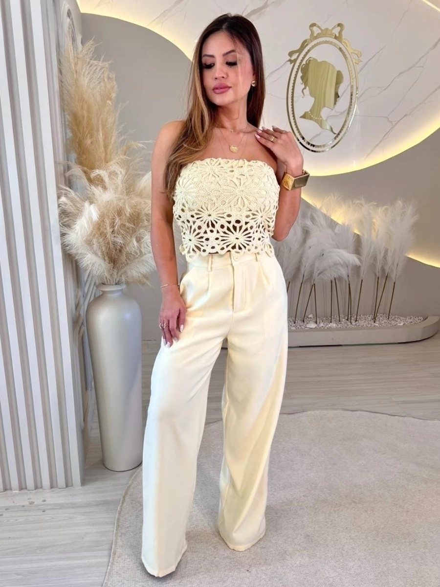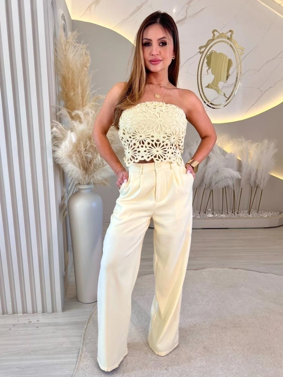 O conjunto foi pensado para proporcionar praticidade e elegância em qualquer ocasião. O cropped de crochê traz o toque artesanal e fresco que valoriza a feminilidade, enquanto a calça de tecido leve e forrado garante conforto e movimento com um caimento impecável.