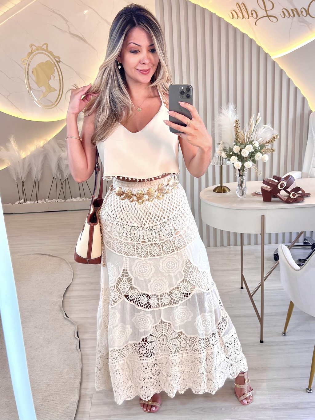 Essa saia em tweed une tradição e requinte em uma peça que valoriza a silhueta com elegância. O tecido encorpado e texturizado proporciona estrutura e caimento refinado, enquanto os detalhes — como o botão cravejado e o zíper posterior — reforçam o acabamento sofisticado. Os bolsos laterais e as pregas delicadas trazem charme e funcionalidade ao design, tornando-a ideal para composições clássicas com um toque contemporâneo.