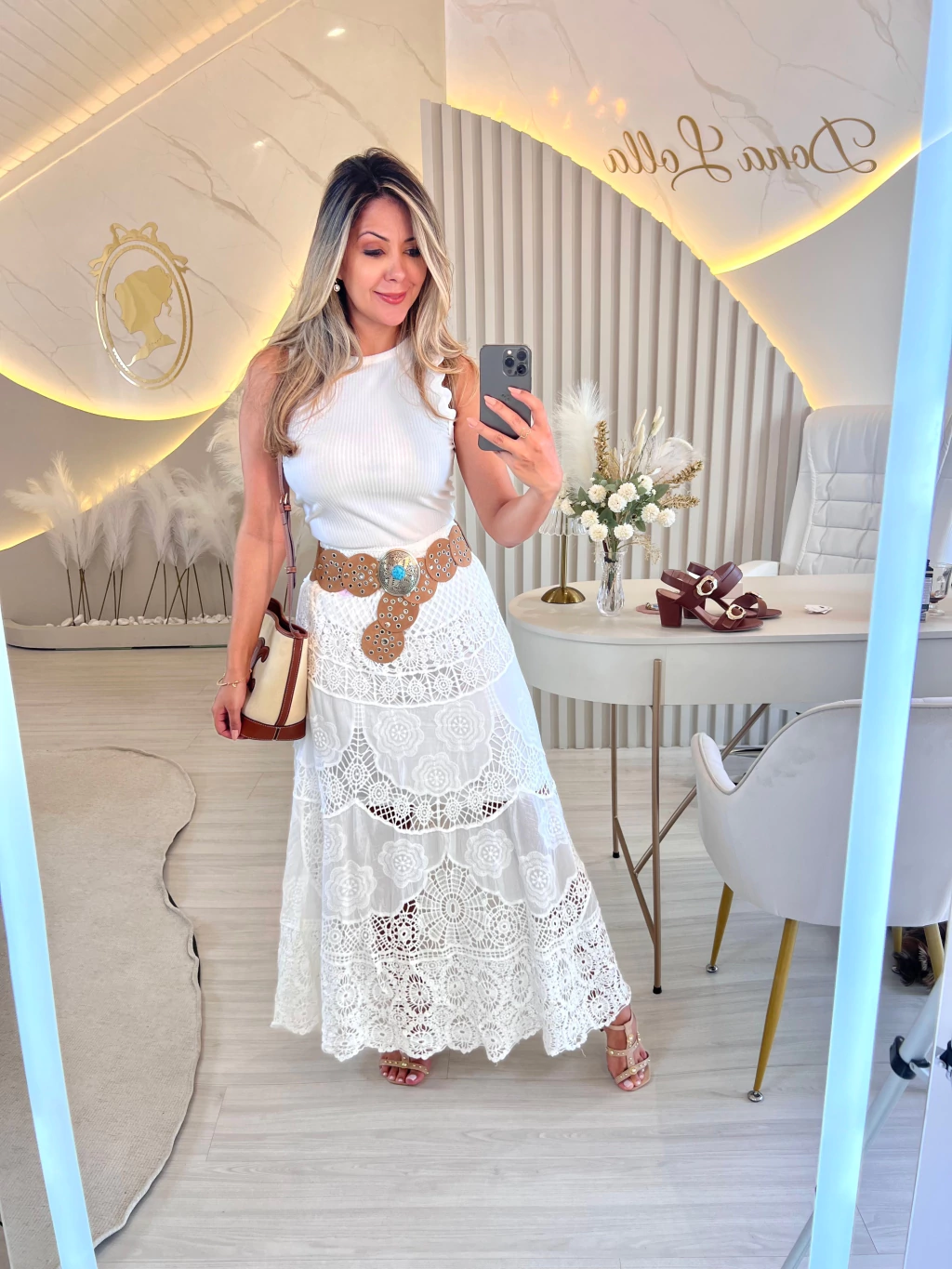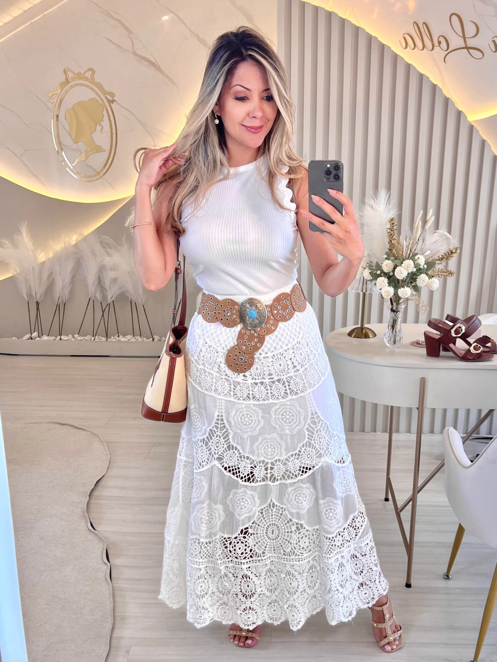 Essa saia é uma peça longa, em estilo boho-chic, confeccionada em renda branca com um design sofisticado e delicado. Possui uma modelagem fluída e detalhes vazados que conferem leveza e feminilidade ao look.