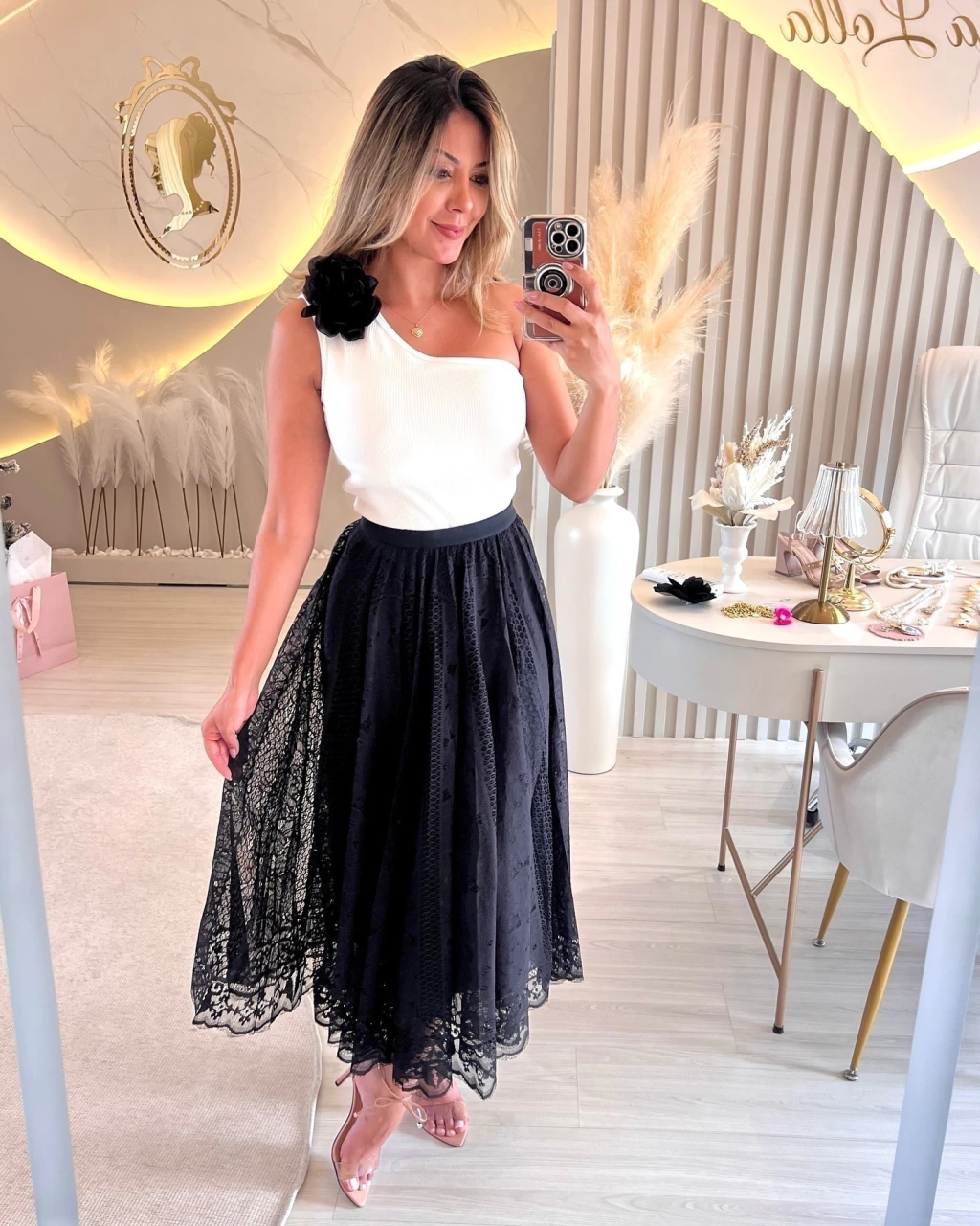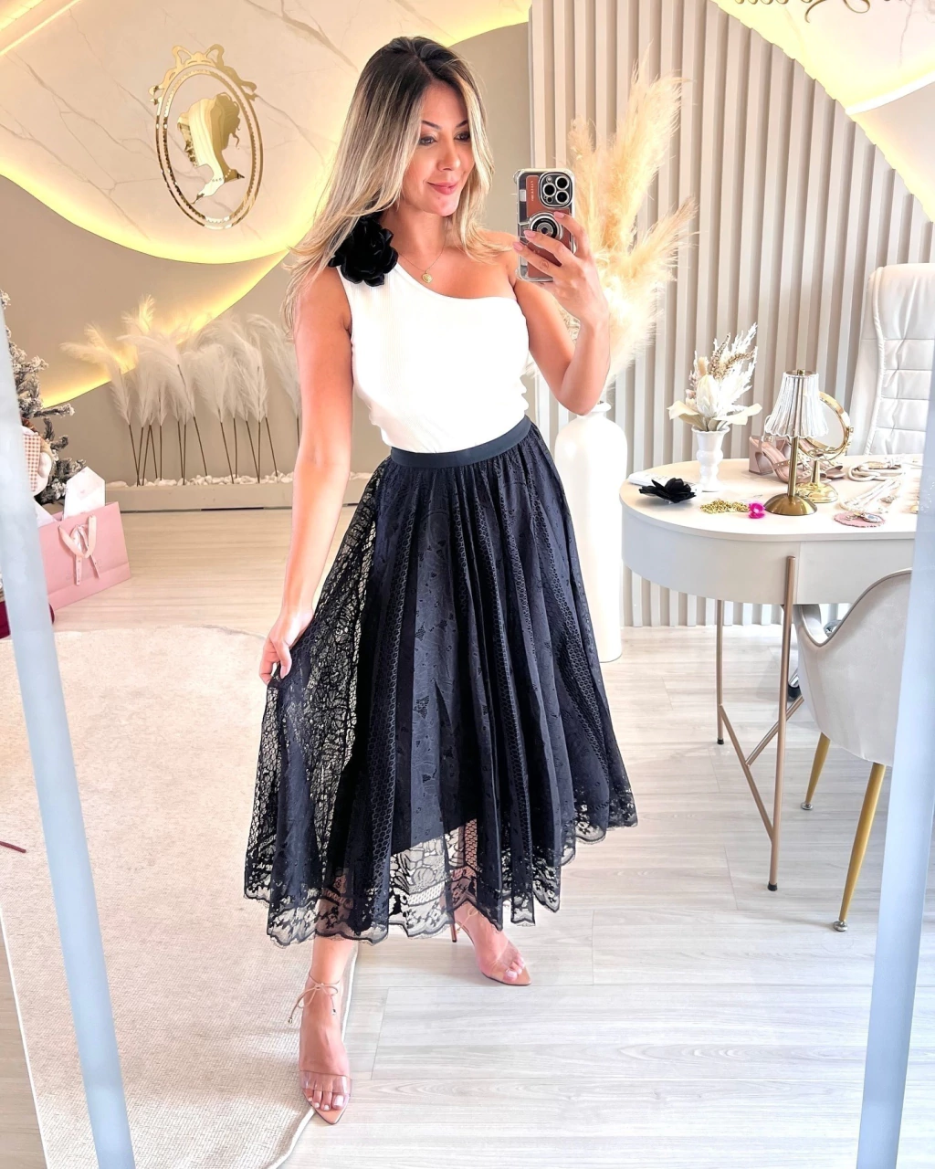 Embarque em um conto de elegância atemporal com a nossa saia de renda, confeccionada inteiramente em renda de delicada textura e padrões intrincados.