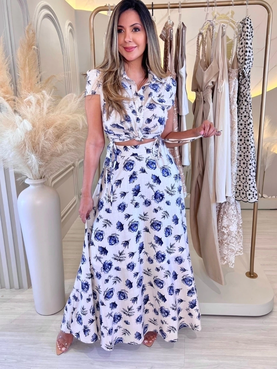 Esta saia midi é a expressão do equilíbrio entre delicadeza e sofisticação. Com estampa de rosas azuis e modelagem evasê, oferece caimento fluido e confortável, valorizando a silhueta com sutileza. O cós ajustado proporciona um ajuste perfeito na cintura, ideal para compor looks versáteis com blusas neutras, adequados para múltiplas ocasiões.