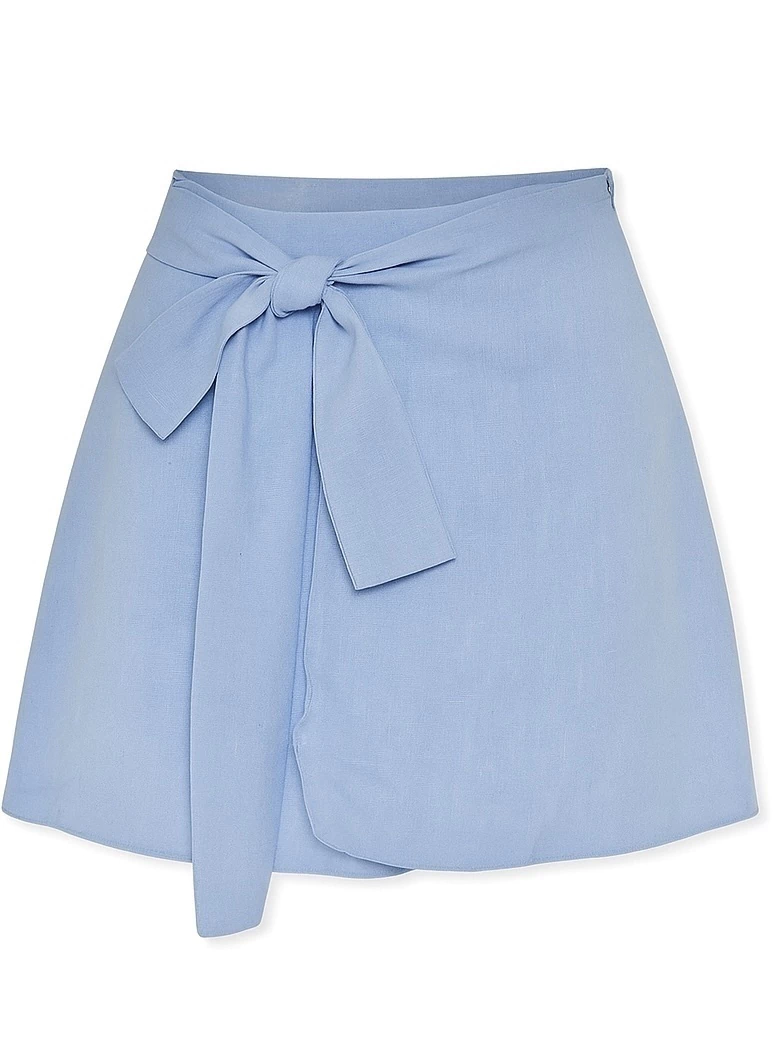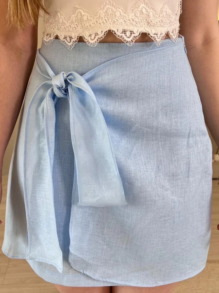 A Saia Curta em Linho Azul com Amarração Frontal é sinônimo de charme e frescor. Feita em linho de alta qualidade, ela oferece toque leve, caimento natural e conforto térmico, perfeita para dias ensolarados e produções delicadas.