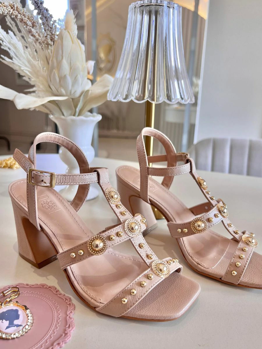 Elegância e conforto se encontram neste modelo pensado para acompanhar diferentes momentos do seu dia. Com salto largo, que proporciona firmeza ao caminhar, e acabamento em tom neutro com delicados toques dourados, a sandália oferece um visual refinado e atemporal.