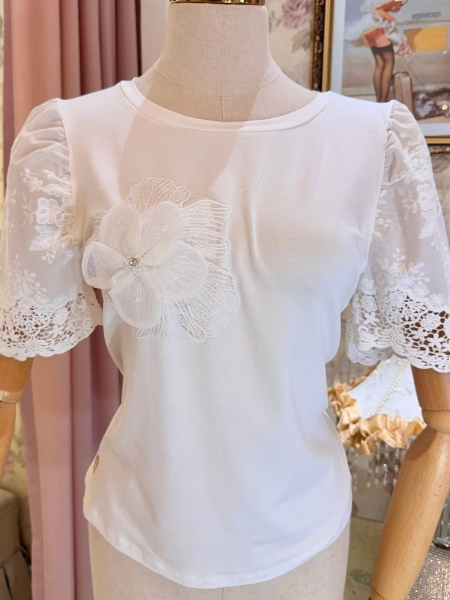 T-shirt Ester Feminina com Flor 3D e Manga em Renda – Conforto e Elegância para Todos os Dias