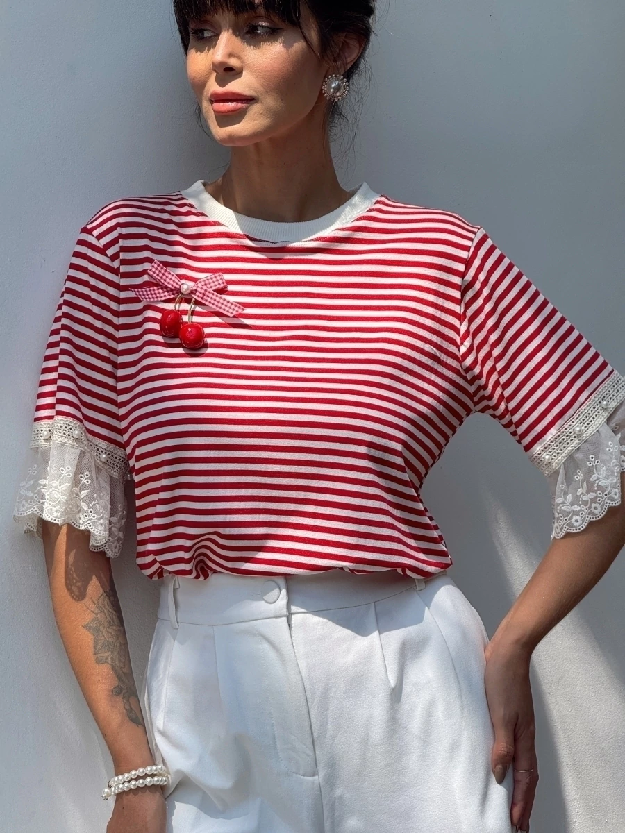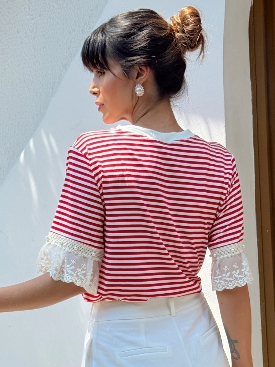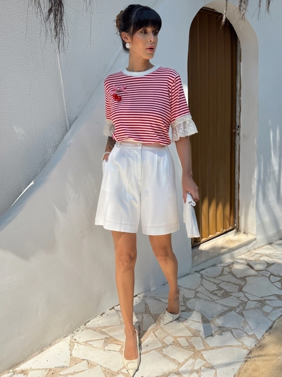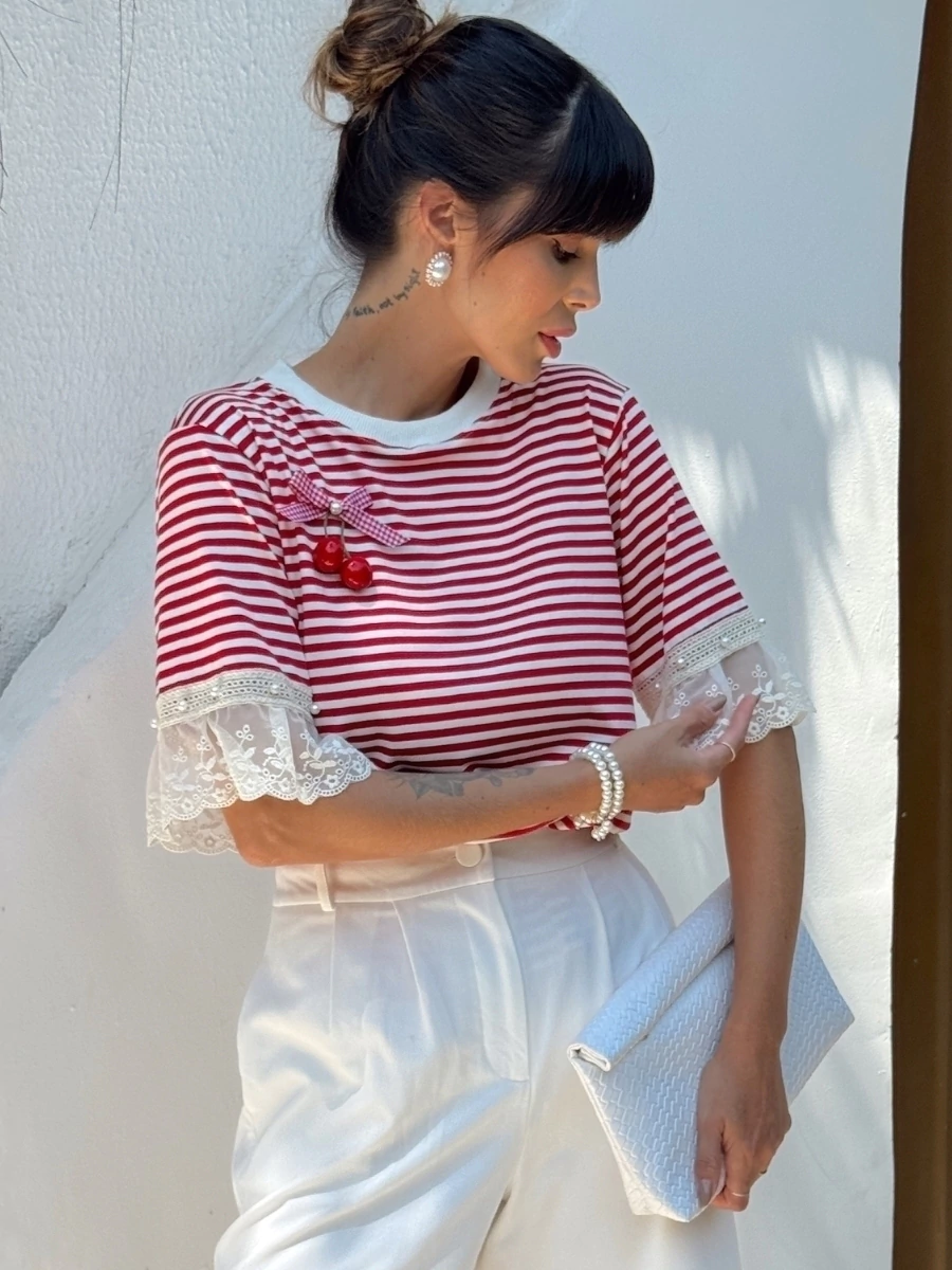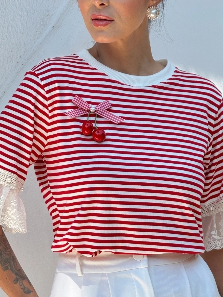 A T-shirt listrada é perfeita para quem busca praticidade e estilo no dia a dia. Com detalhe delicado de cerejinha, traz um toque moderno e feminino, sendo ideal para compor desde looks casuais até produções mais sofisticadas.