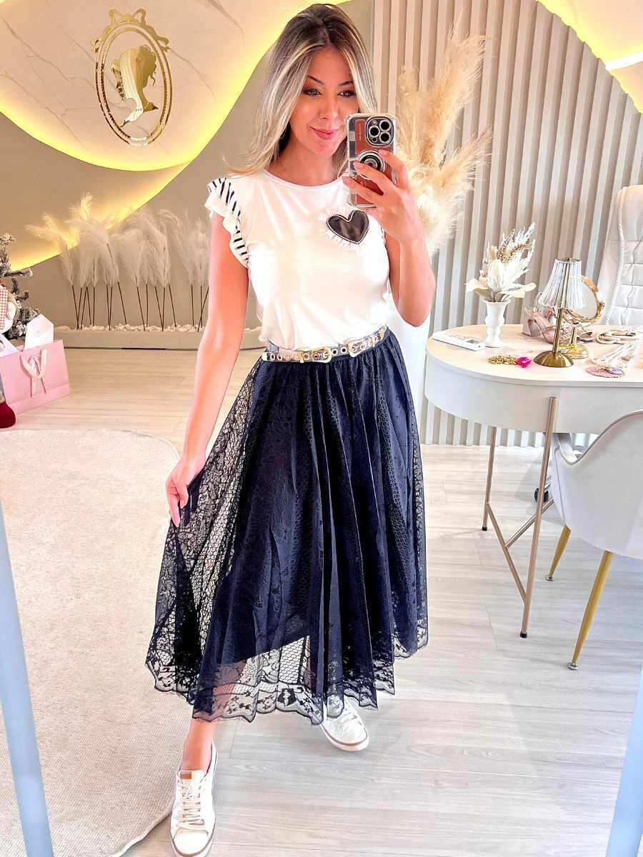 Apresentamos a nossa T-shirt Bruna, uma peça que vai além da moda, proporcionando um abraço de conforto e um toque de duçura ao seu visual diário. Com a aplicação cuidadosa de um adorável laço, esta camiseta adiciona uma dose de charme e feminilidade ao seu guarda-roupa.