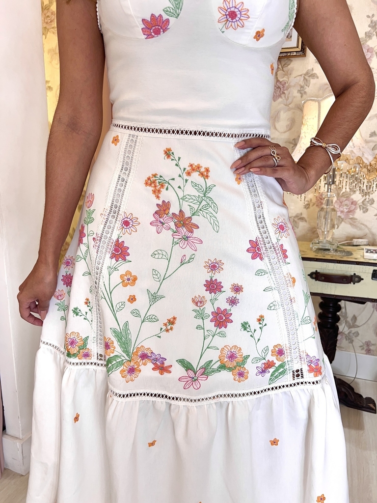 O recorte estruturado no busto com formato coração valoriza o colo, enquanto os entremeios em ponto palito trazem um charme artesanal e um toque de sofisticação ao visual. A saia midi com barrado amplo e aplicação de pequenas flores bordadas completa a composição com leveza e movimento.