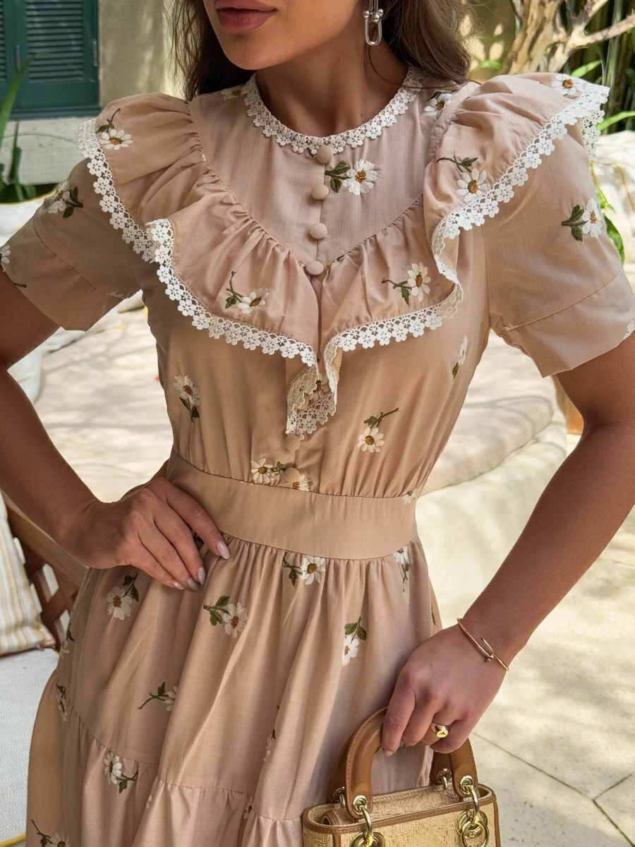 Os bordados industriais de margaridas espalham charme com suavidade, enquanto o babado no decote com acabamento em renda adiciona um toque artesanal e ultra feminino. A fileira de botões forrados reforça o romantismo, e a saia com recortes franzidos oferece fluidez e movimento a cada passo.