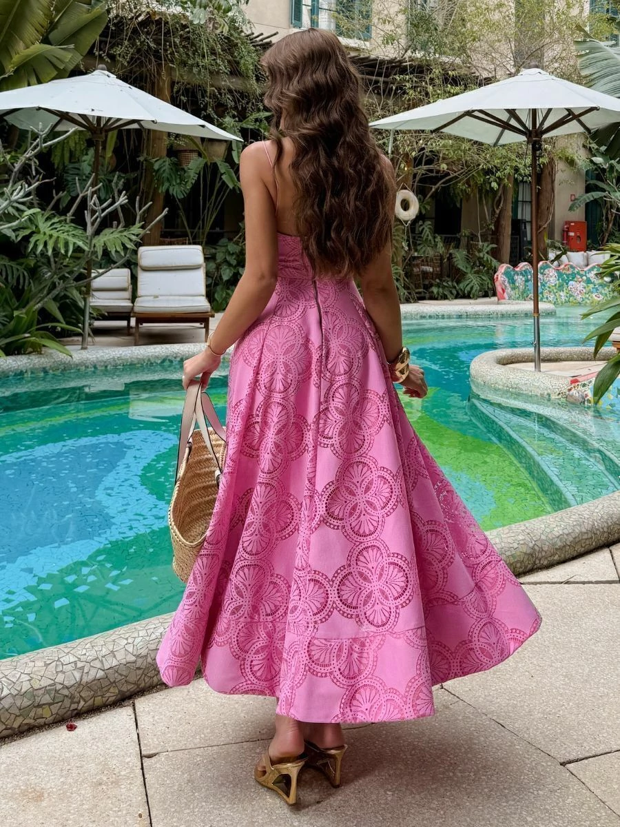 Confeccionado em renda rosa com padronagem geométrica exclusiva, entrega textura rica e um visual marcante. O busto estruturado com decote coração e alcinhas finas valoriza o colo e a silhueta, enquanto a saia midi rodada proporciona movimento leve e feminino.