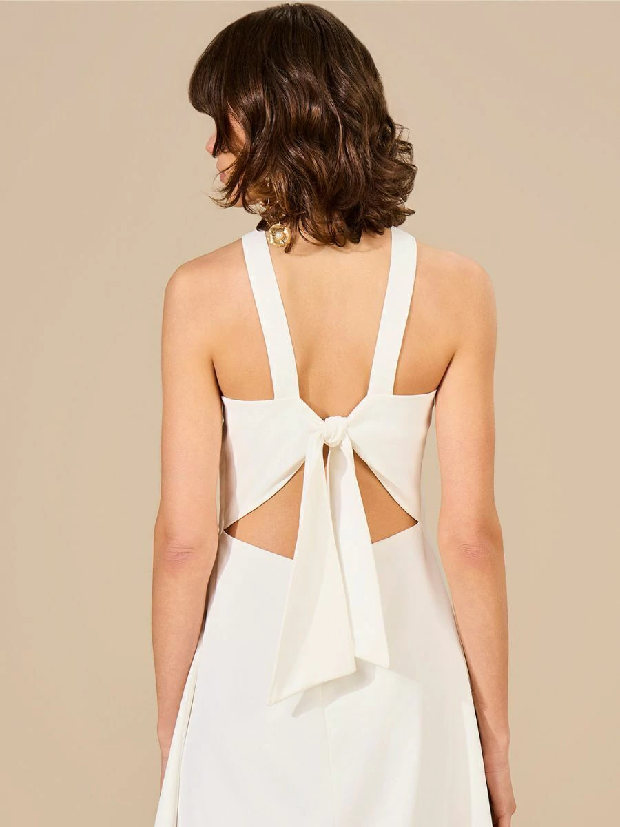 O decote halter com alças cruzadas e detalhe em argola na frente valoriza o colo e adiciona um toque moderno à composição. Sua saia midi com caimento solto garante movimento e conforto, enquanto as fendas laterais sutis trazem charme e liberdade aos passos.