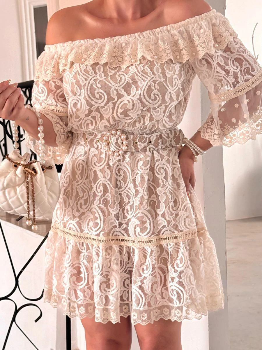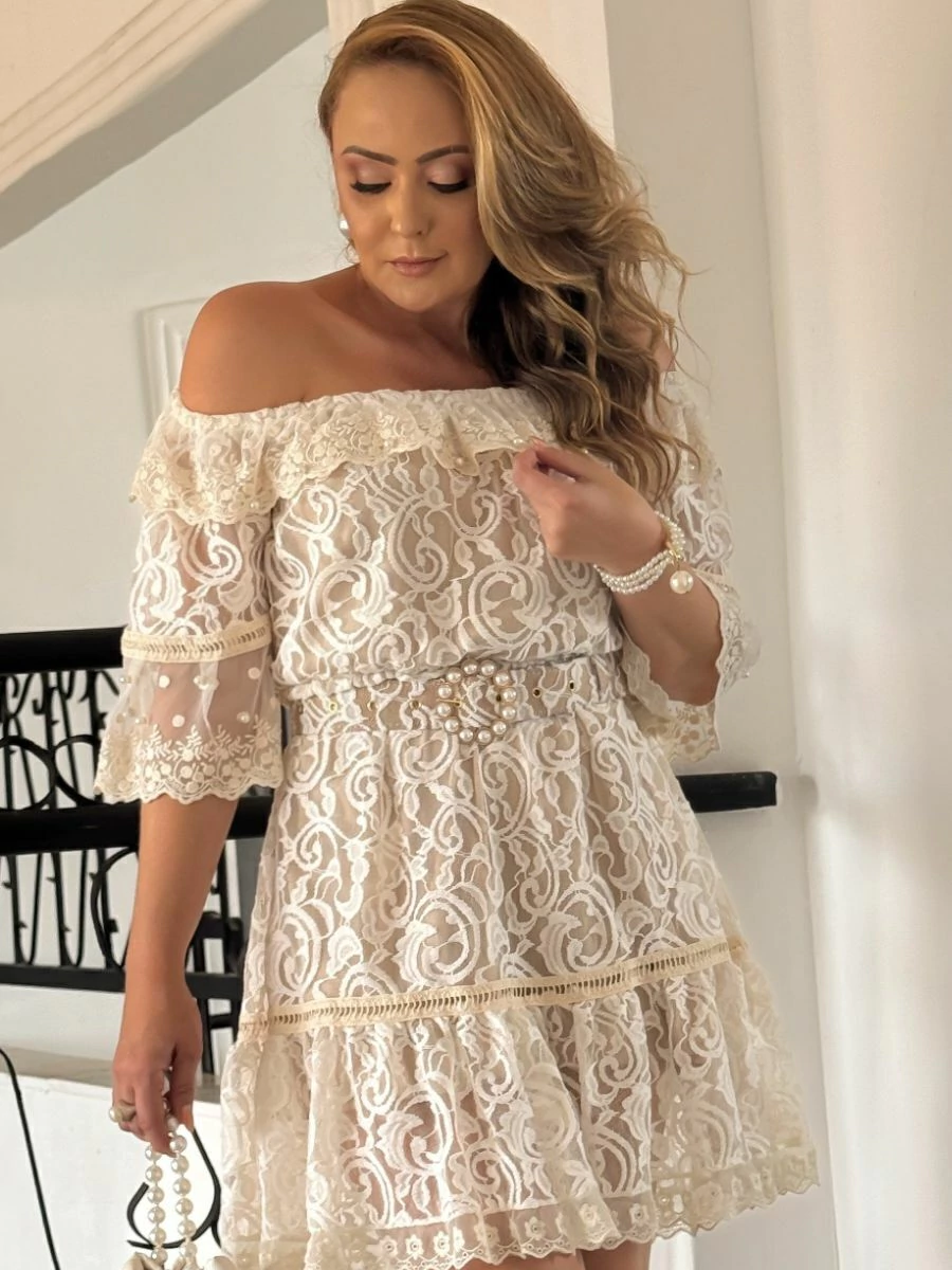 Vestido Angela em renda off com forro nude, modelagem ombro a ombro e um toque luxuoso de pérolas aplicadas.