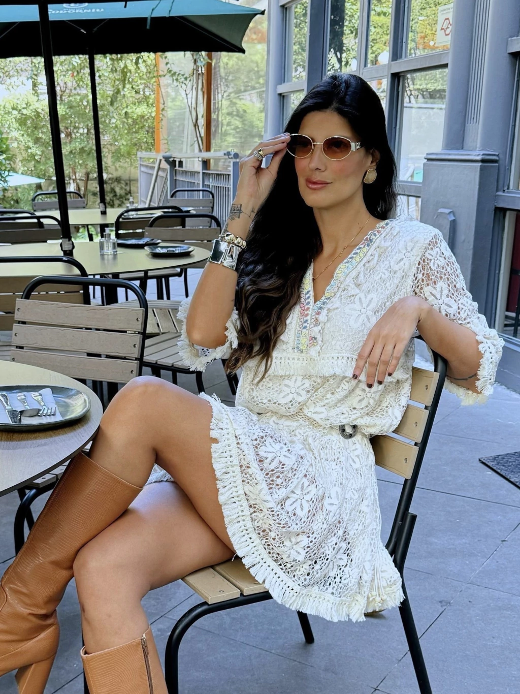 Esse vestido traz um ar leve e sofisticado, confeccionado em renda branca com detalhes vazados, conferindo um toque romântico e boho-chic.