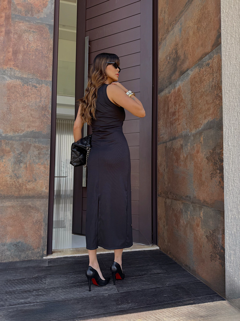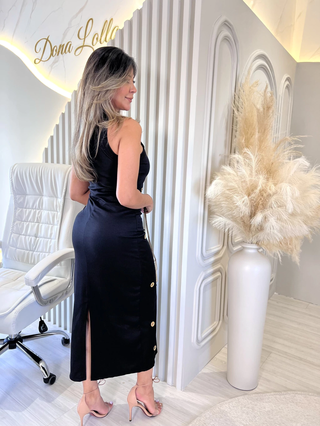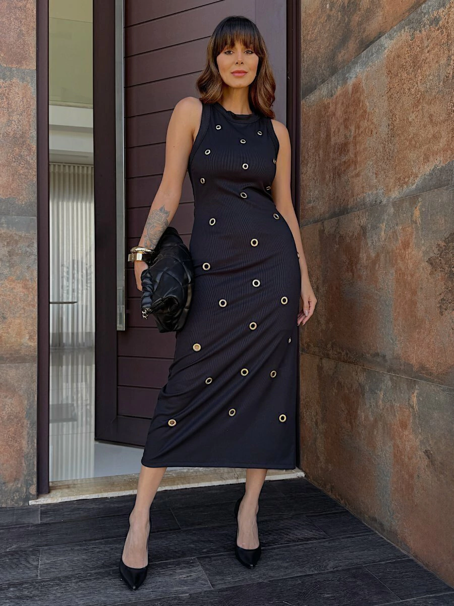 O Vestido Midi Carina é a escolha certa para quem busca uma peça única que combina conforto, estilo e elegância. Confeccionado em malha canelada encorpada na cor preta, ele se ajusta ao corpo valorizando a silhueta com caimento impecável. O destaque fica por conta dos apliques de ilhós metálicos dourados, que adicionam um toque contemporâneo ao visual.