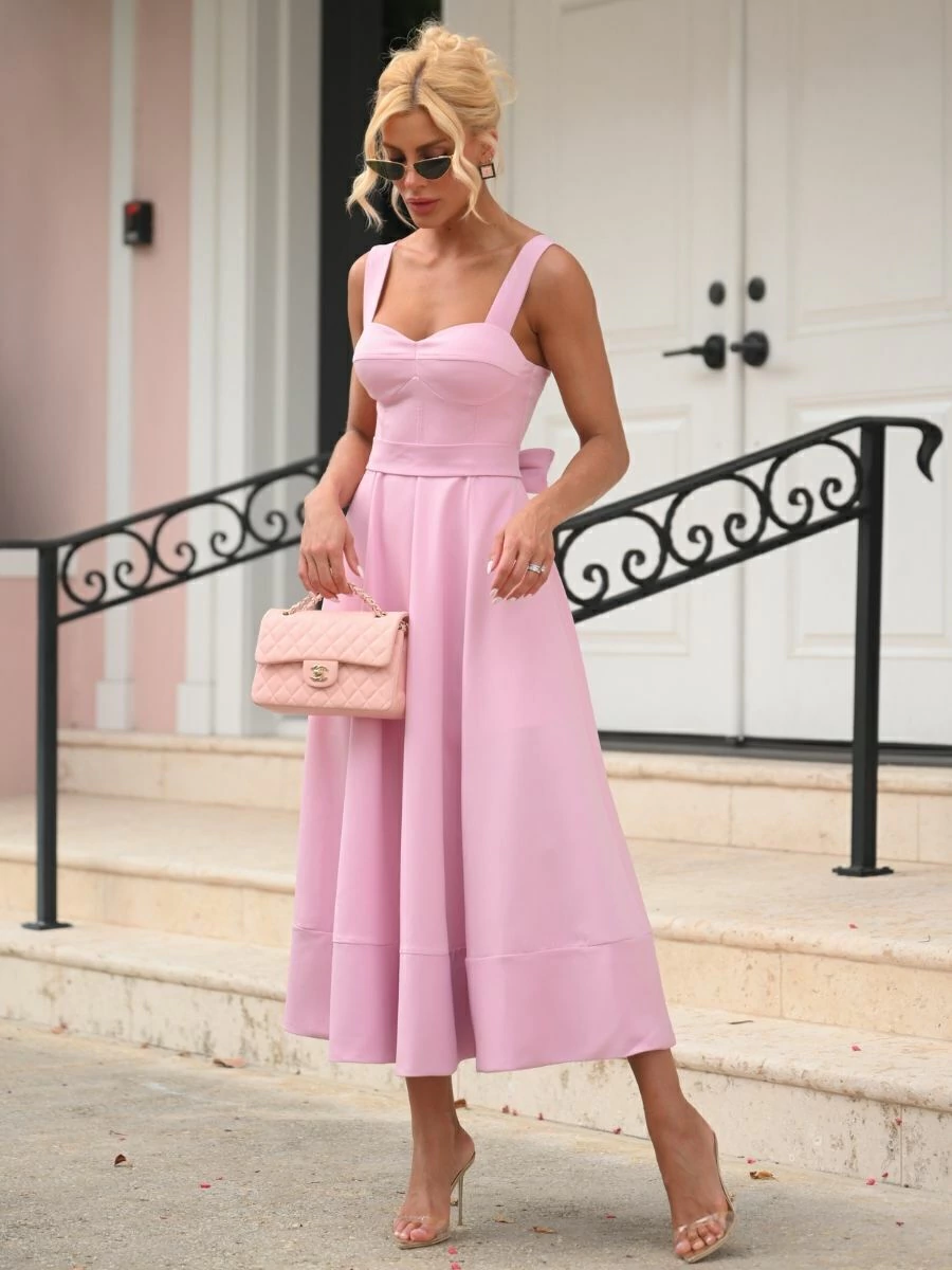 A silhueta marcada valoriza o corpo, enquanto o busto com recorte tipo corset destaca o colo com delicadeza. O cinto de laço adiciona charme, e as alças largas junto ao lastex garantem conforto e ajuste perfeito.