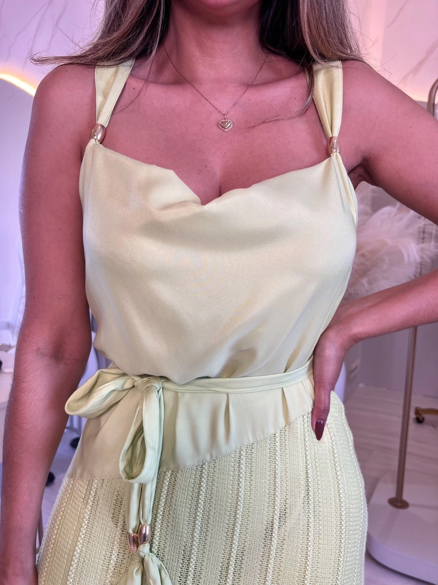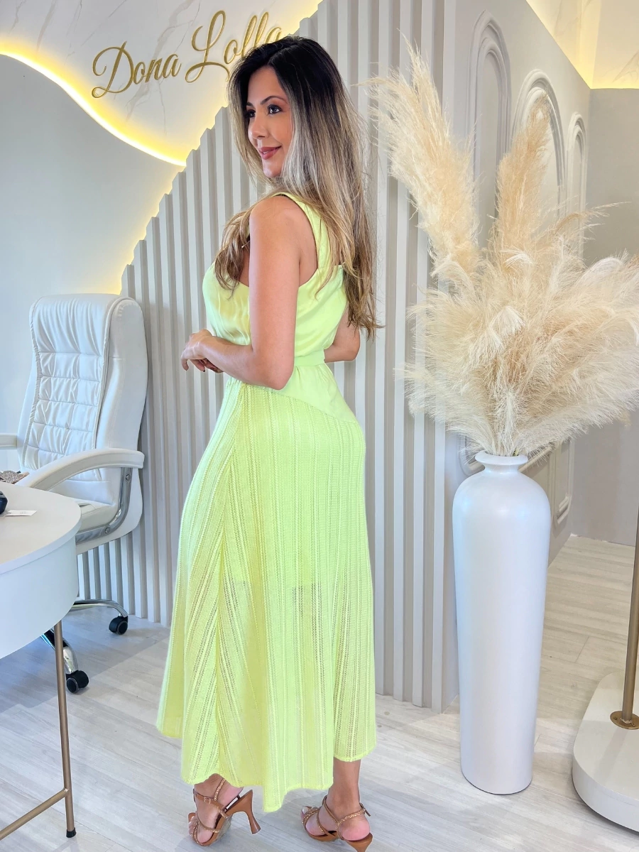 O Vestido Cloe é a peça perfeita para quem busca sofisticação com um toque de modernidade. Com um comprimento elegante e na deslumbrante cor verde lima, este vestido é ideal para quem deseja se destacar de maneira refinada. O decote sutilmente desenhado realça a feminilidade do modelo, enquanto os detalhes dourados nas alças e no cinto adicionam um toque de luxo e elegância ao conjunto. Outro destaque é a textura tipo renda, que cobre o vestido, criando um efeito delicado e romântico. A camada de renda é propositalmente mais longa que o forro, oferecendo um contraste interessante e moderno, que dá movimento e leveza à peça.