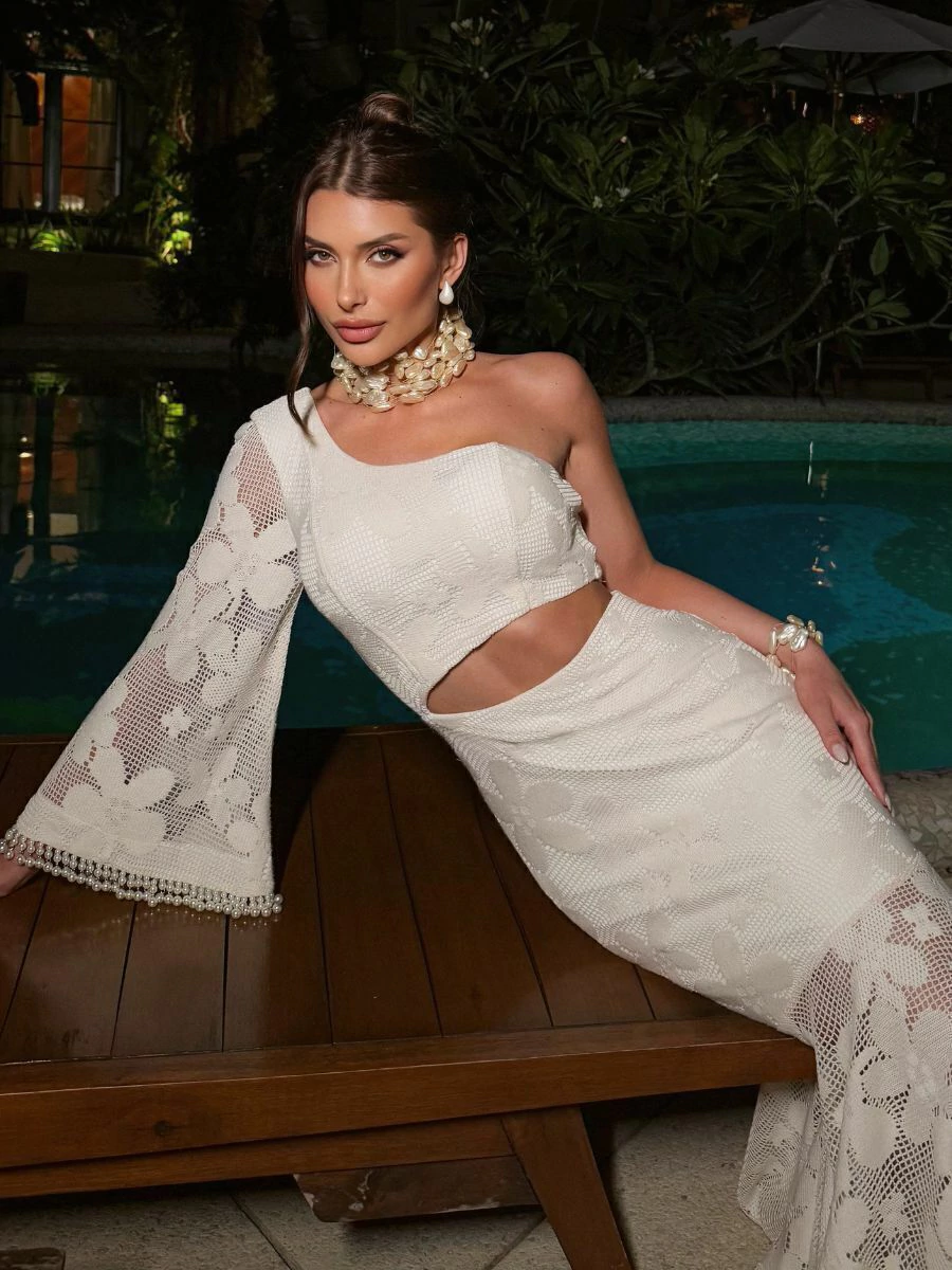 O recorte cut-out assimétrico na cintura traz um elemento ousado e contemporâneo, criando um jogo de formas que valoriza a região da cintura e dá um toque de sensualidade sutil, sem perder a elegância.