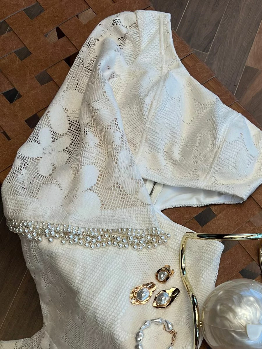 Este vestido midi off-white de malha crochê é uma peça sofisticada e moderna, ideal para quem deseja um visual elegante e contemporâneo.