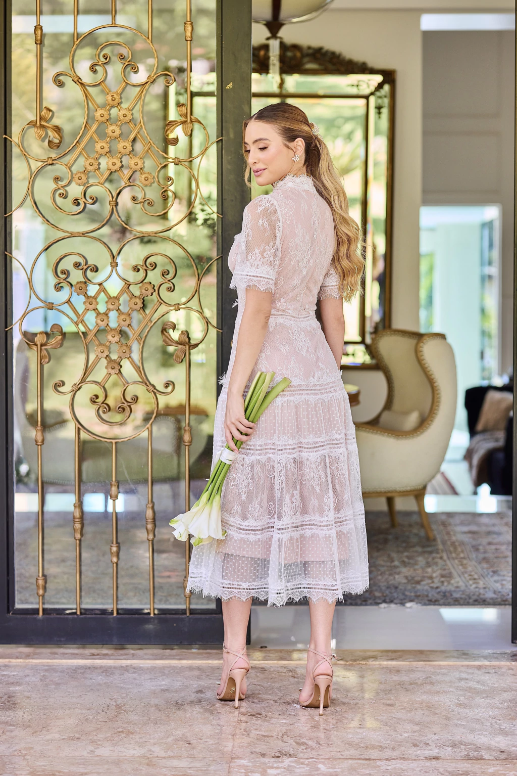 Este vestido midi em tom suave apresenta um visual delicado e refinado. Com mangas curtas e gola fechada, é confeccionado em tule bordado com detalhes florais e rendas estrategicamente posicionadas, valorizando o caimento da peça. A saia em camadas proporciona leveza e movimento, enquanto o forro discreto assegura conforto e elegância. Perfeito para ocasiões especiais que exigem um toque romântico e sofisticado.