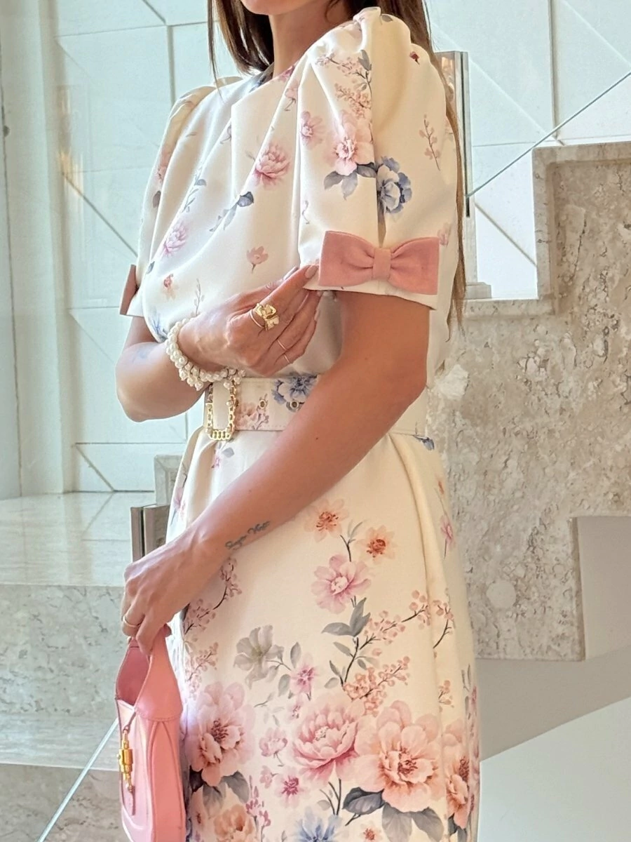 A silhueta é suavemente marcada pelo cinto coberto, com fivela de pérolas e o toque final vem no max laço em rosa.