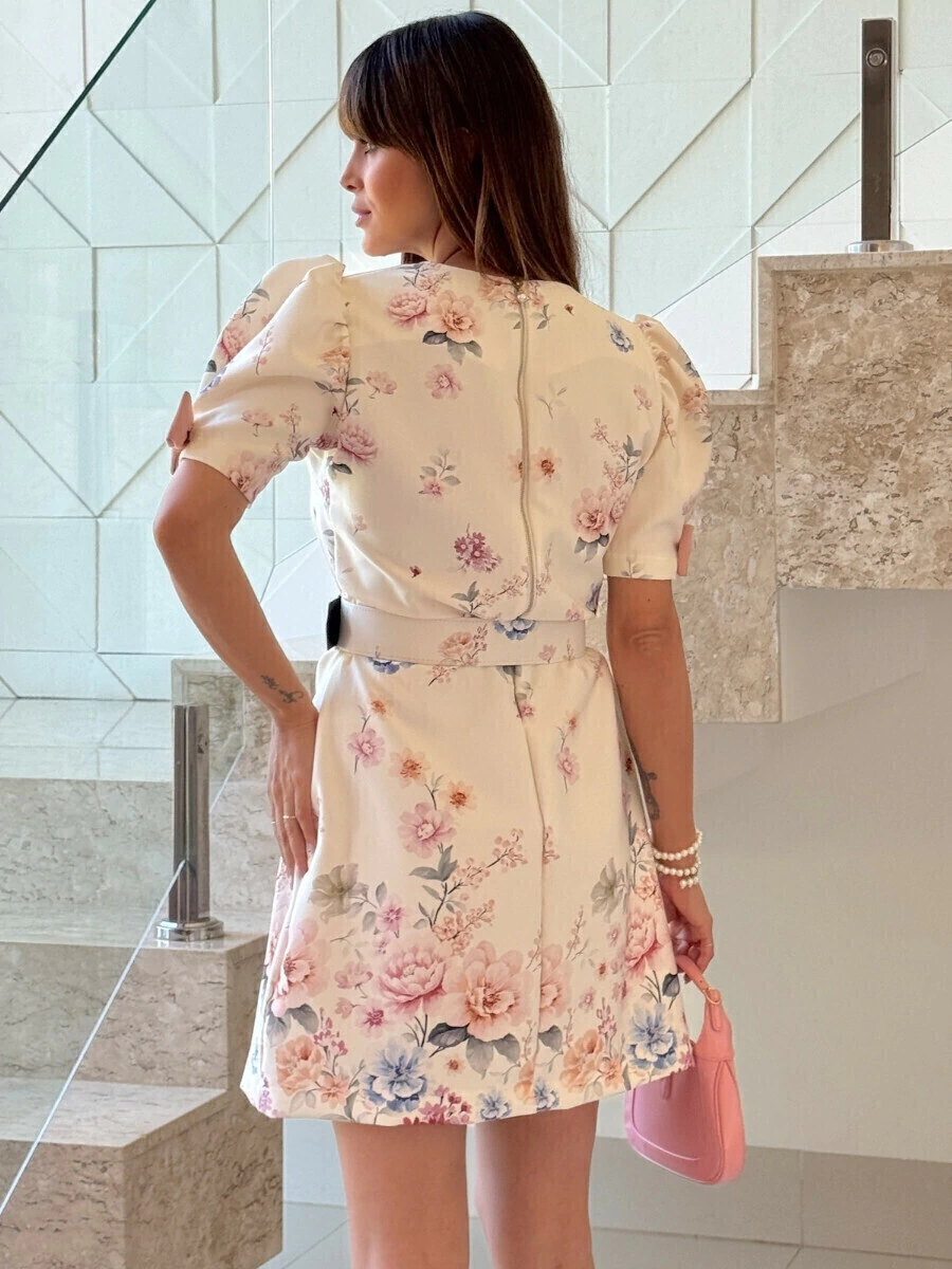 Florais em harmonia elegante: vestido em crepe alfaiataria com estampa autoral e barrado posicionado que valoriza o movimento da peça.