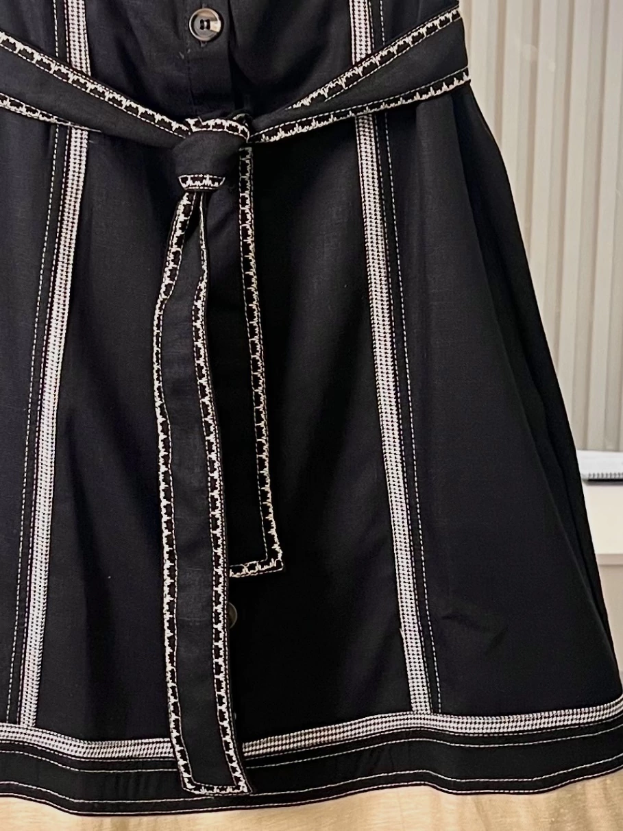 Este vestido longo sem mangas alia tons sóbrios a um contraste elegante. Apresenta abotoamento frontal e gola tipo camisa, conferindo um visual alinhado e contemporâneo.
