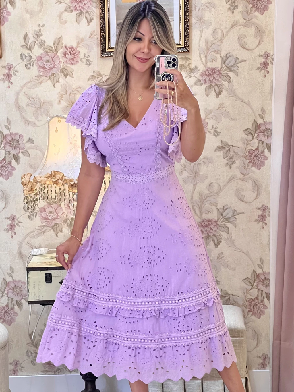 Confeccionado em laise com aplicações em guipir, este vestido midi combina leveza e elegância em cada detalhe.
