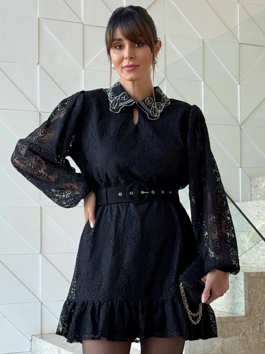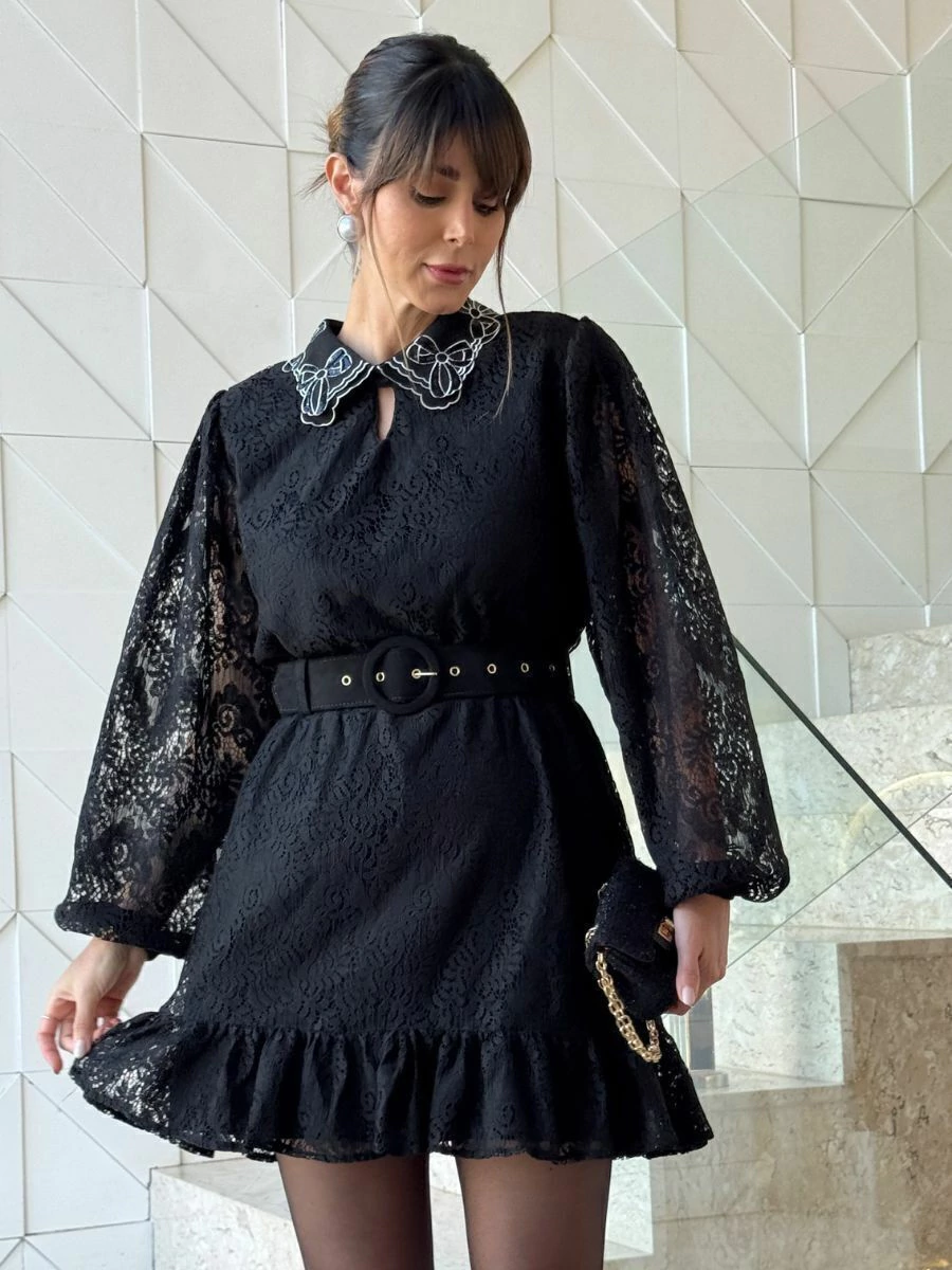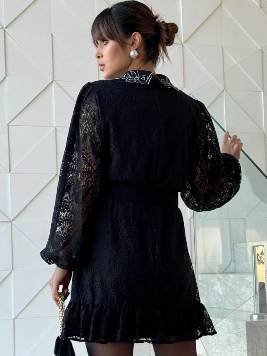 Este vestido preto todo em renda destaca-se pelo trabalho delicado de textura e pela gola contrastante em branco, adornada com laços que trazem sutis pontos de brilho — um detalhe elegante que ilumina a região do colo com sofisticação.