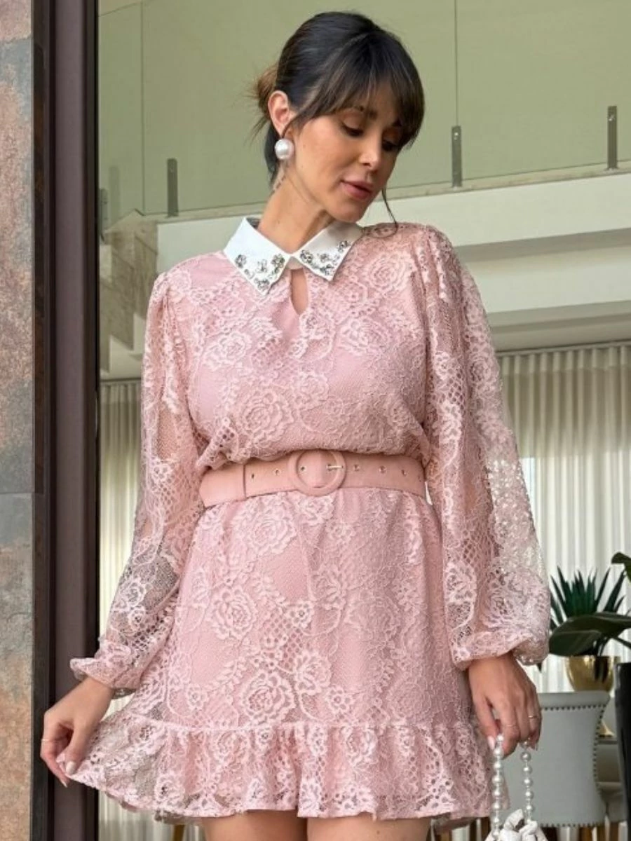 Delicado e sofisticado, este vestido rendado em tom rosa suave conquista pelo equilíbrio entre feminilidade e elegância.