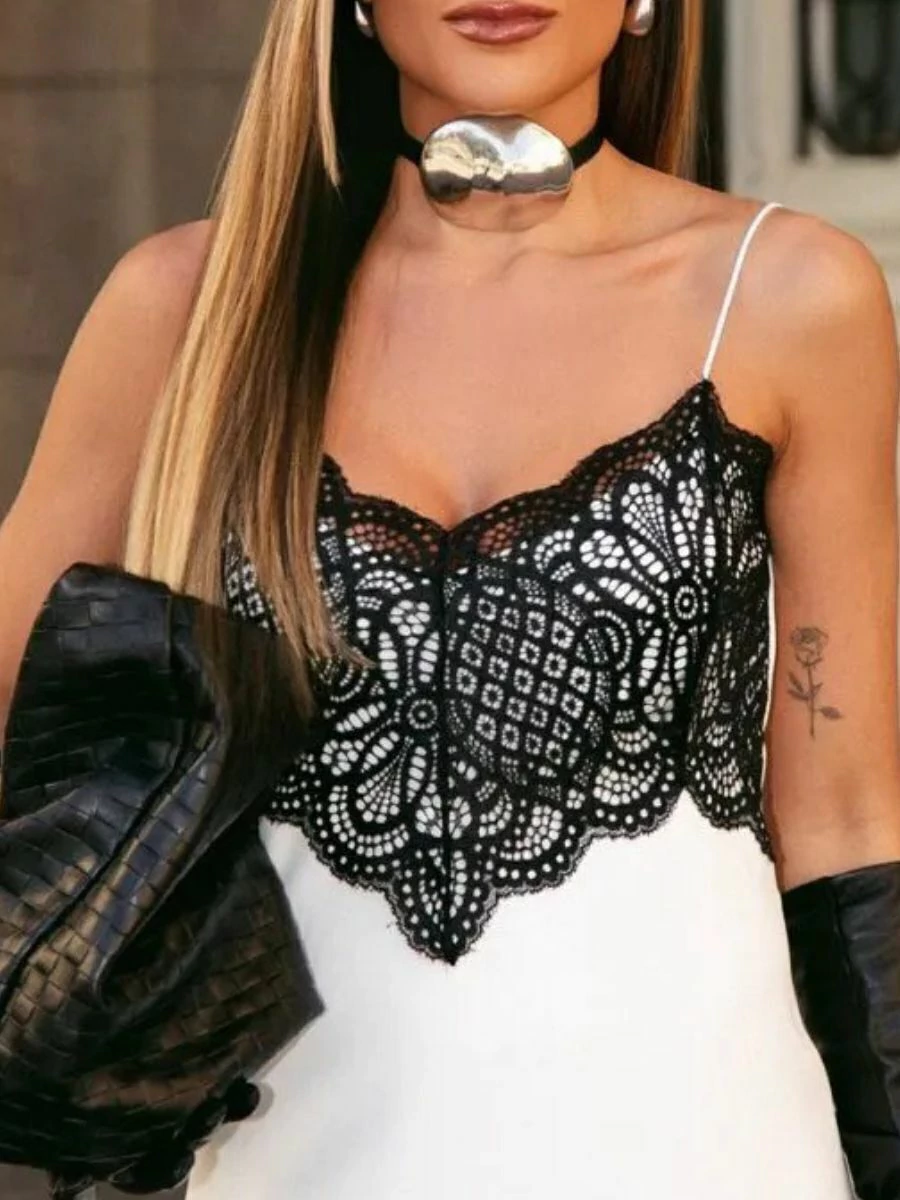 O diferencial está no detalhe rendado em preto, posicionado estrategicamente sobre o busto, que acrescenta profundidade e contraste refinado, elevando o design a um patamar exclusivo de elegância.
