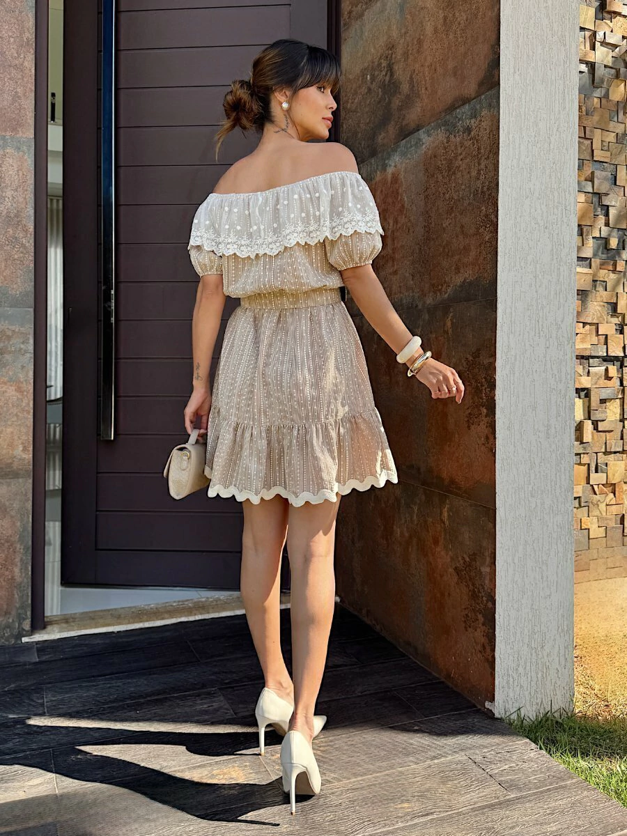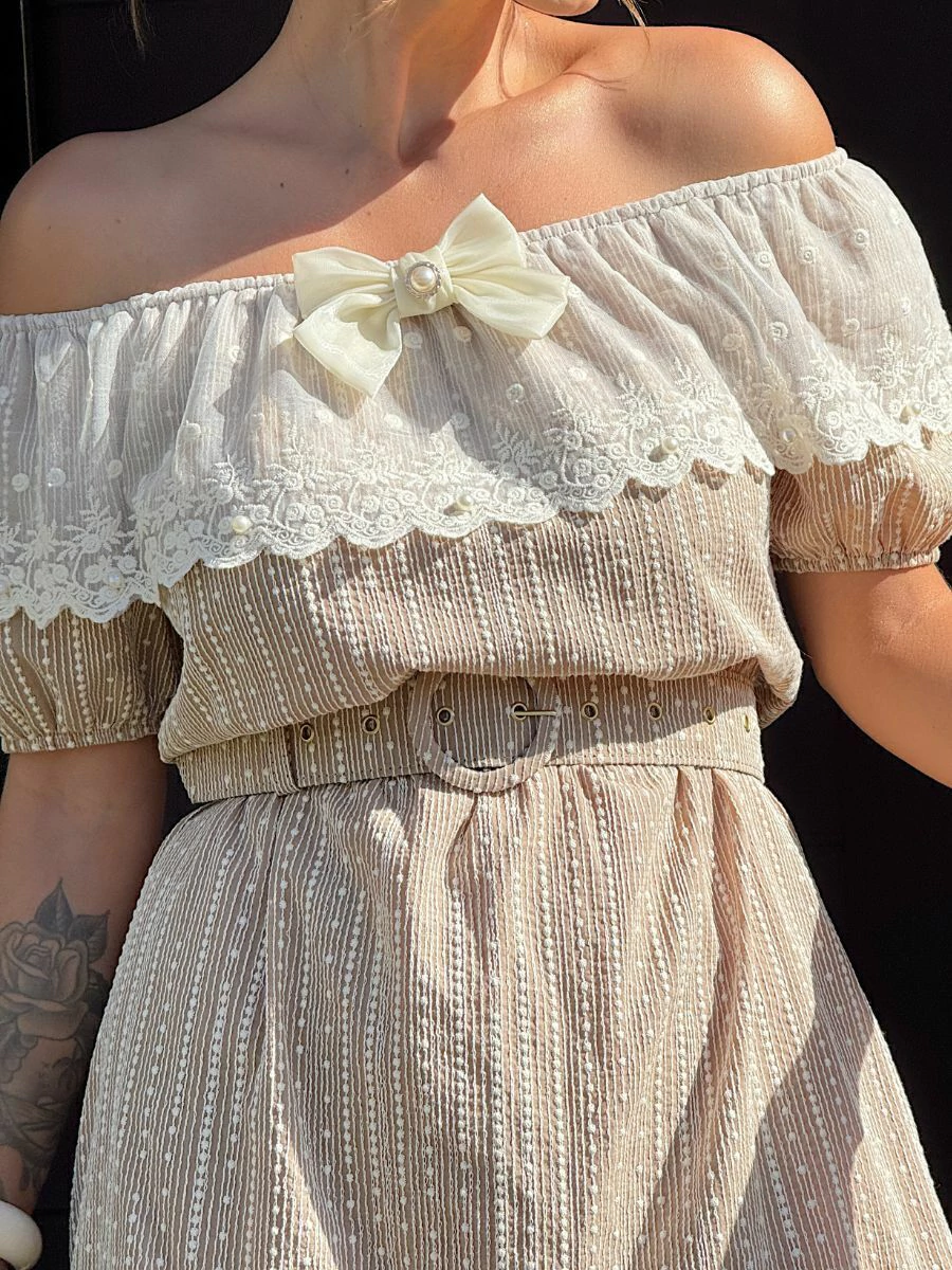 O busto é adornado com renda de algodão e um laço central, acrescentando um toque romântico e detalhado à composição. A cintura é ajustada com cinto do mesmo tecido com fivela forrada, e a saia tem leve movimento com acabamento em recorte sutil na barra.