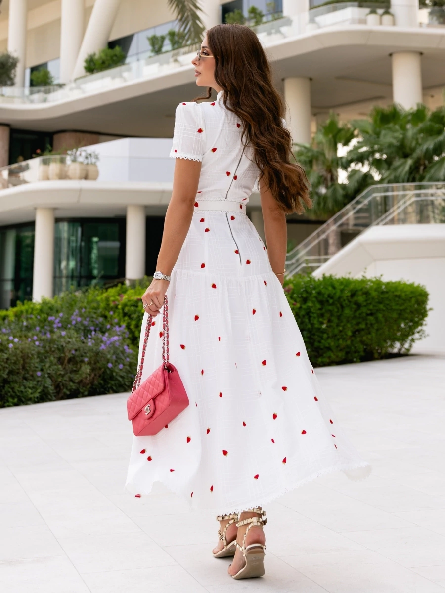 Esse modelo midi em tecido branco texturizado ganha ainda mais charme com os delicados bordadinhos em formato de moranguinhos espalhados por toda a peça.