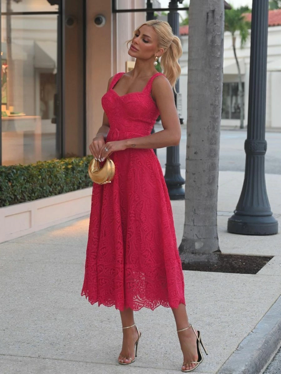 O Vestido Madona traduz essa tendência em uma versão ultra feminina, feita em renda delicada com caimento impecável. A modelagem estruturada com busto tipo corset valoriza o colo, enquanto as alças largas e a saia midi godê criam uma silhueta elegante e cheia de movimento.
