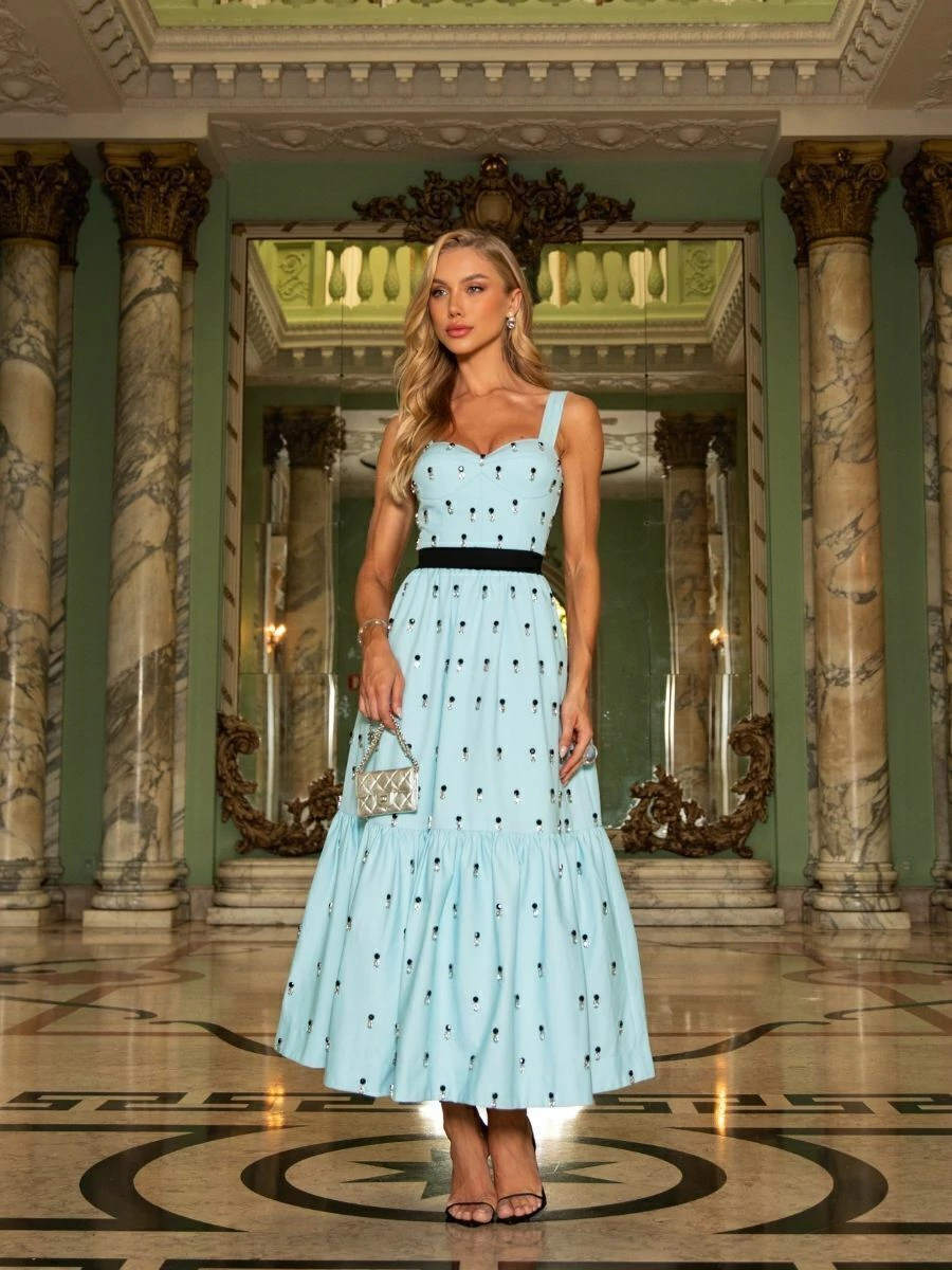As alças largas e os recortes godê franzidos acrescentam um toque de sofisticação, enquanto as aplicações de bordados manuais em pedraria preta e cristal elevam o visual a um novo patamar. O cinto de laço preto que acompanha a peça traz um charme ao look.