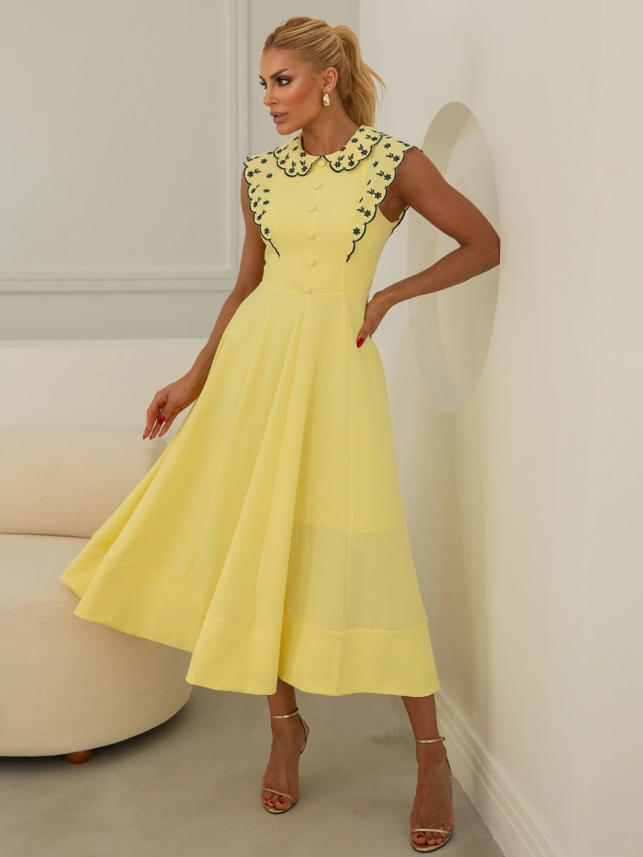 O busto apresenta fileira frontal de botões forrados para um toque clássico, enquanto a gola Peter Pan com bordados florais pretos em acabamento ondulado adiciona um ar romântico e refinado.
